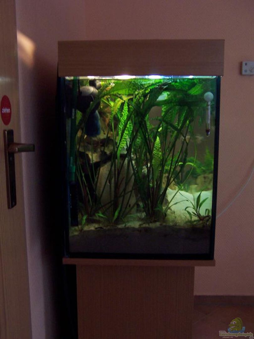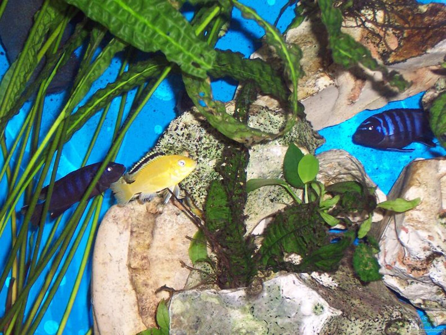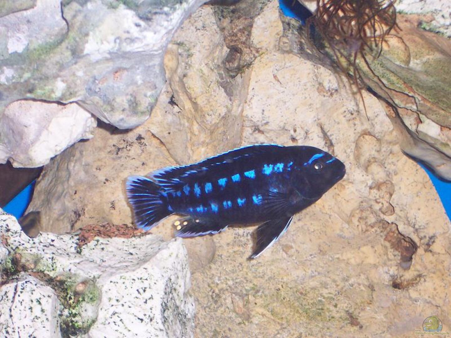 Als Hintergrund dient eine neutrale blaue Folie au??erhalb des Beckens. Im AQ sind ca. 80 kg Lochgestein. Au??erdem habe ich noch ein Keramik U-Boot, welches zusätzliche Rückzugsmöglichkeiten bietet.