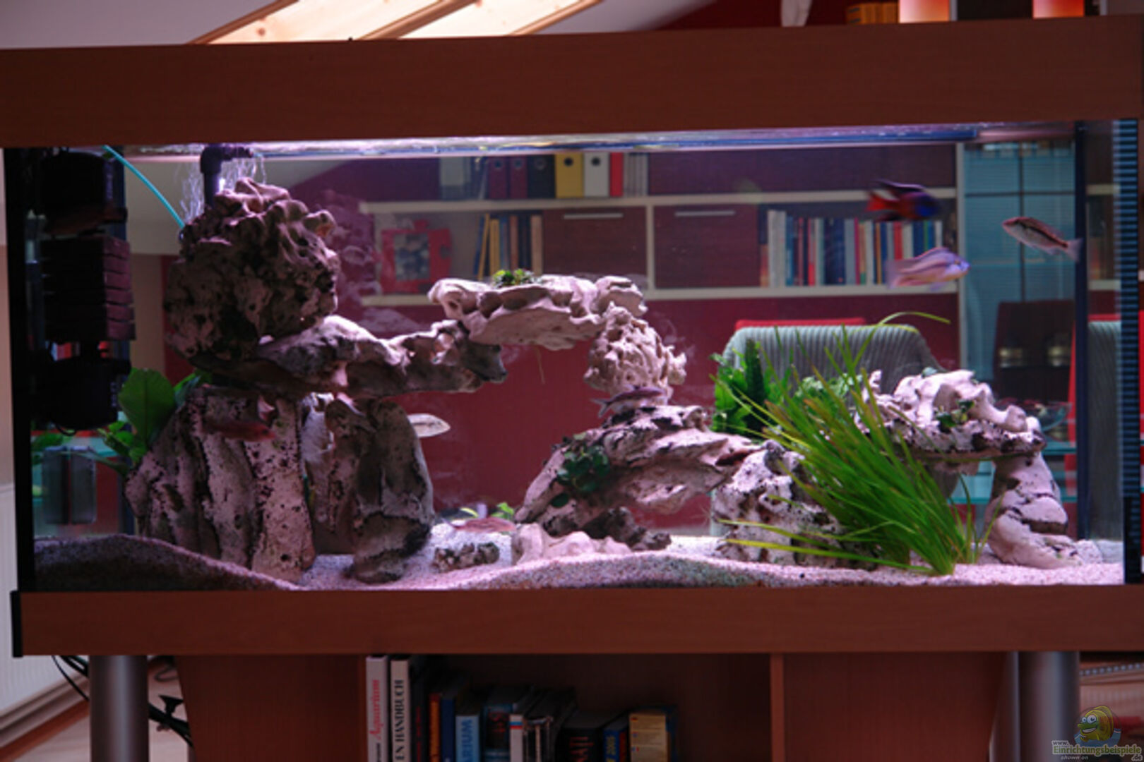 2 Bohrungen am Beckenboden für Zu- und Ablauf. Das Aquarium dient als Raumteiler. Stromzufuhr durch den Boden des Unterschranks.