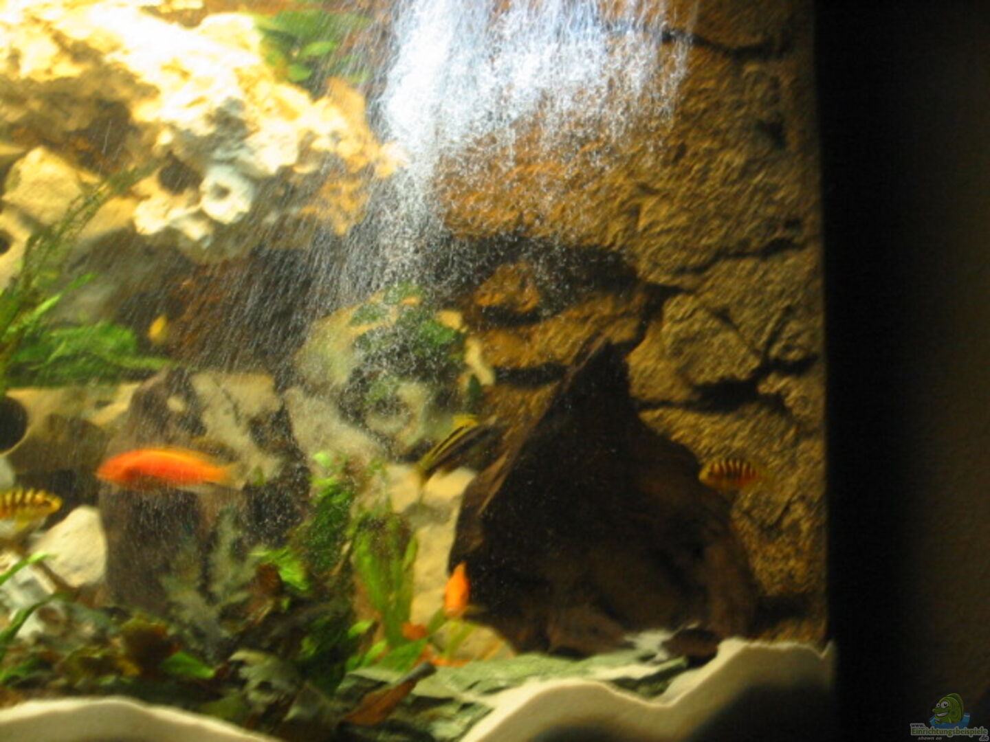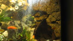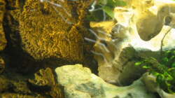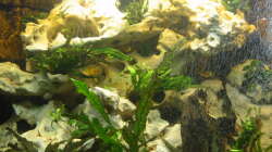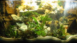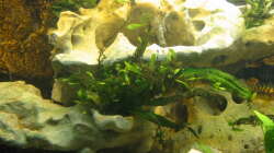 ca. 90 kg jugoslawisches Lochgestein ( wie eine Geröllawine in der Ecke plaziert dadurch sind diverse Versteckmöglichkeiten entstanden ) , verschiedene kleinere Steine mit persönlichem Wert , 3 kleine Stuecke Holz für meine Welse aus dem vorherigen Becken.
