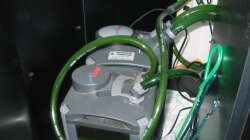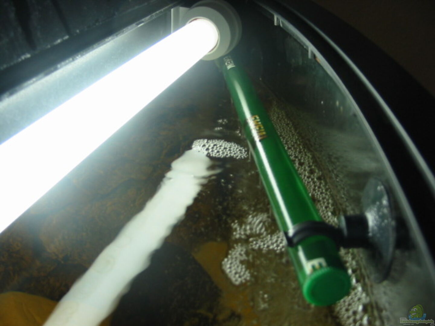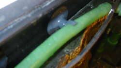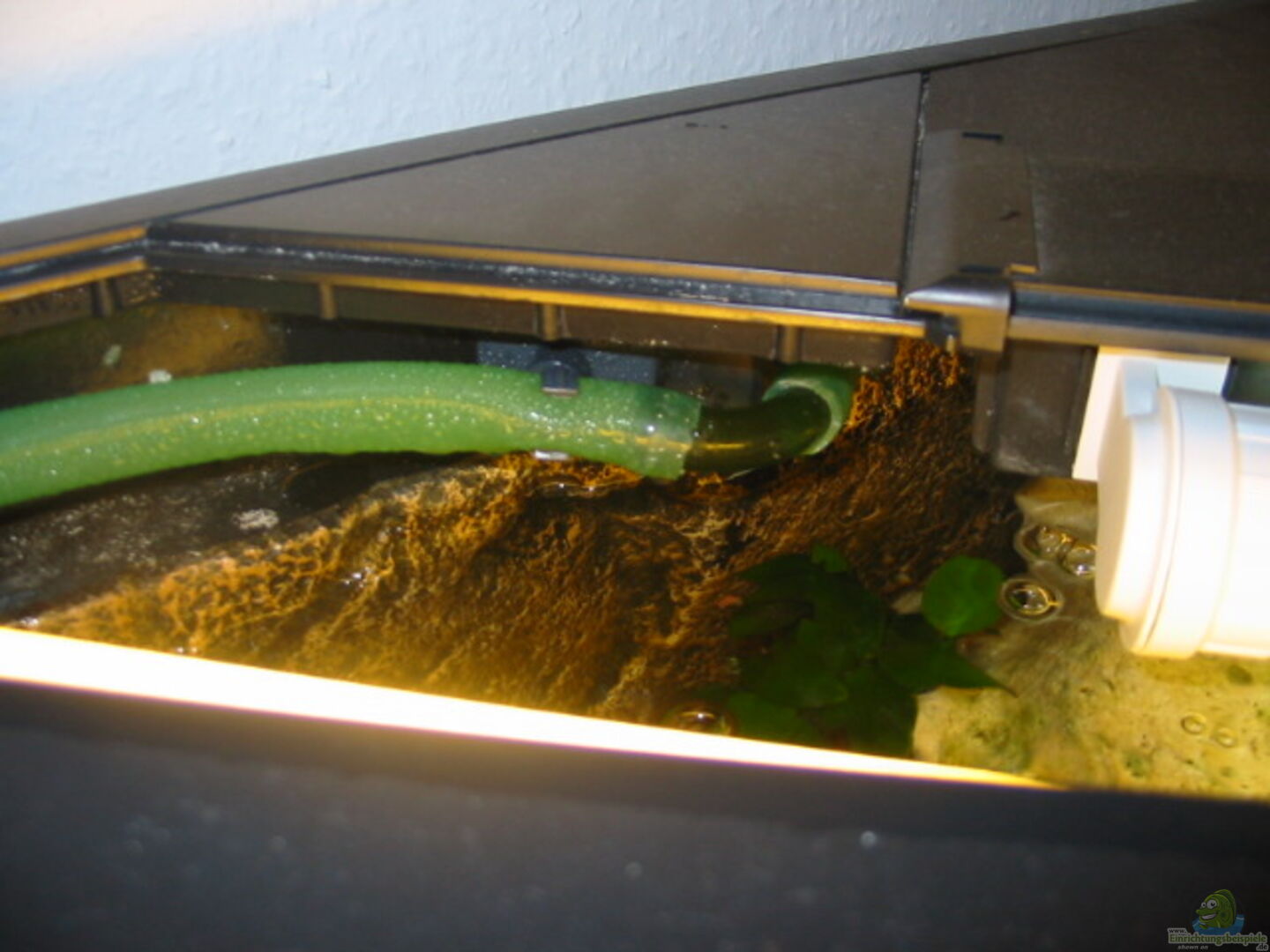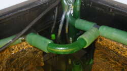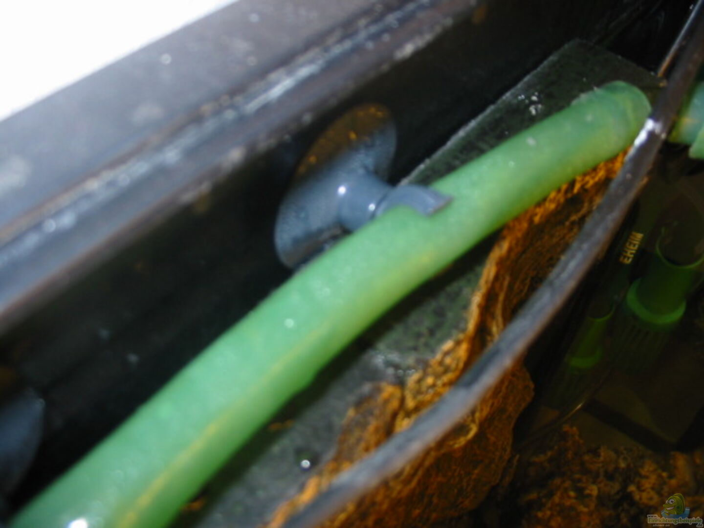 Die Filter sind so angelegt , dass sie jeder für sich Wasser ansaugen ( in meiner Technik-Ecke ) nach der Filterung läuft das saubere Wasser aus den Filtern zusammen ins Aquarium. Bevor es jedoch direkt ins Wasser flie??t teile ich den Zufluss wieder , damit es an der rechten und linken Schenkelaussenseite ins Wasser läuft. Dadurch erzeuge ich bei meinem Eckbecken einen Sog von oben ( rechts/links ) nach unten in die Technikecke , wo das Wasser wieder angesaugt wird.