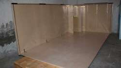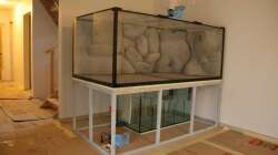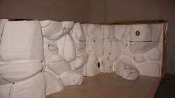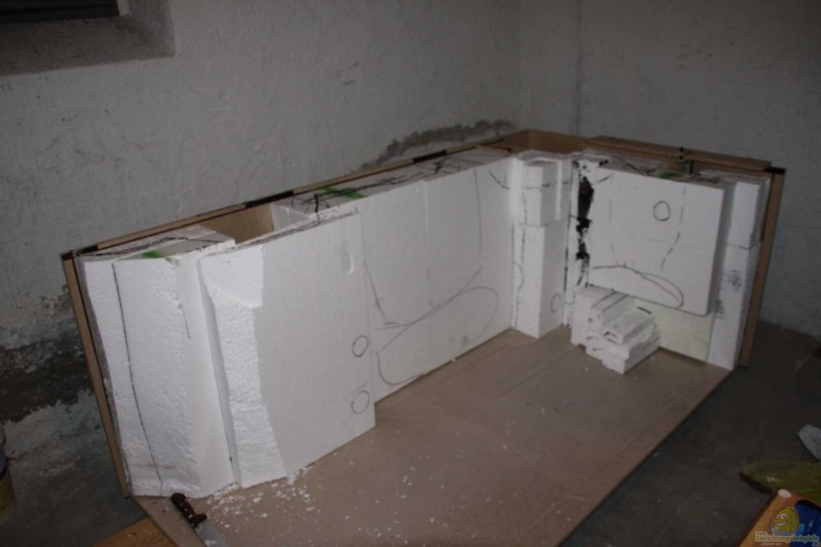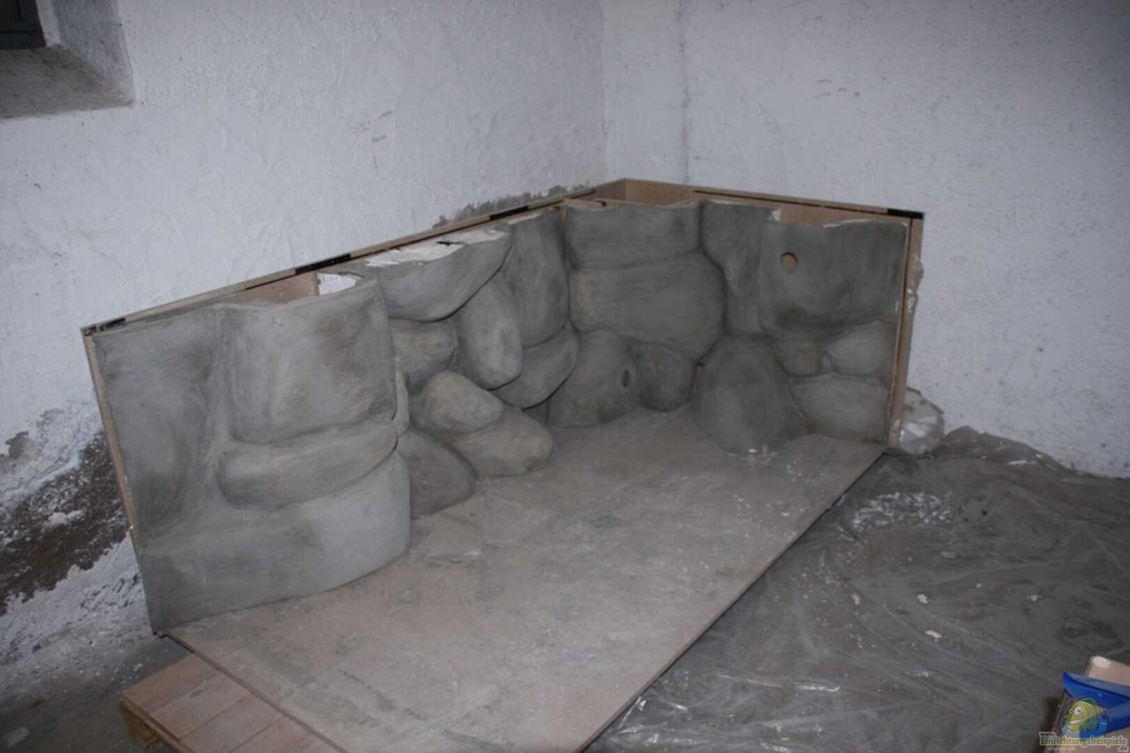 Die Rückwand habe ich selber gemacht. Dazu habe ich das Aquarium d.h. die Bodenplatte, die hintere Scheibe, die Seitenscheibe und den ??berlaufschacht aus Holzspanplatten nachgebaut. Dann wurden Styroporplatten mit Aquariumsilikon verklebt und ins Model eingeklebt und mit dem Messer bearbeitet.
