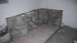 Als die Rückwand nach meinem geschmack war wurde das Styropor mit Zement überzogen. Dann habe ich noch ein paar freistehende Steine gebaut.