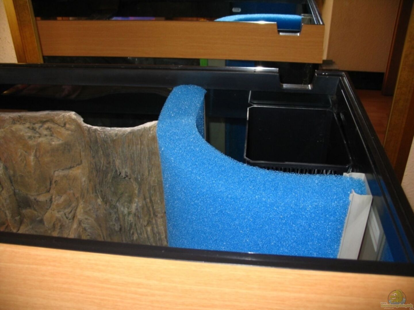 Der Innenfilter liegt hinter Mattenfilter. Aufgrund der verschiedenen Meinungen teste ich es, um mir eigene Erfahrungen zu beschaffen. Der Innenfilter ist noch mit normalen Filtermedien gefüllt (Filtermatten, Kohlefilter, Nitratfilter). Ich werde diese wahrscheinlich durch poröses Granulat ersetzen. Die Pumpe dient auch als Strömungspumpe (1.000 l/h)