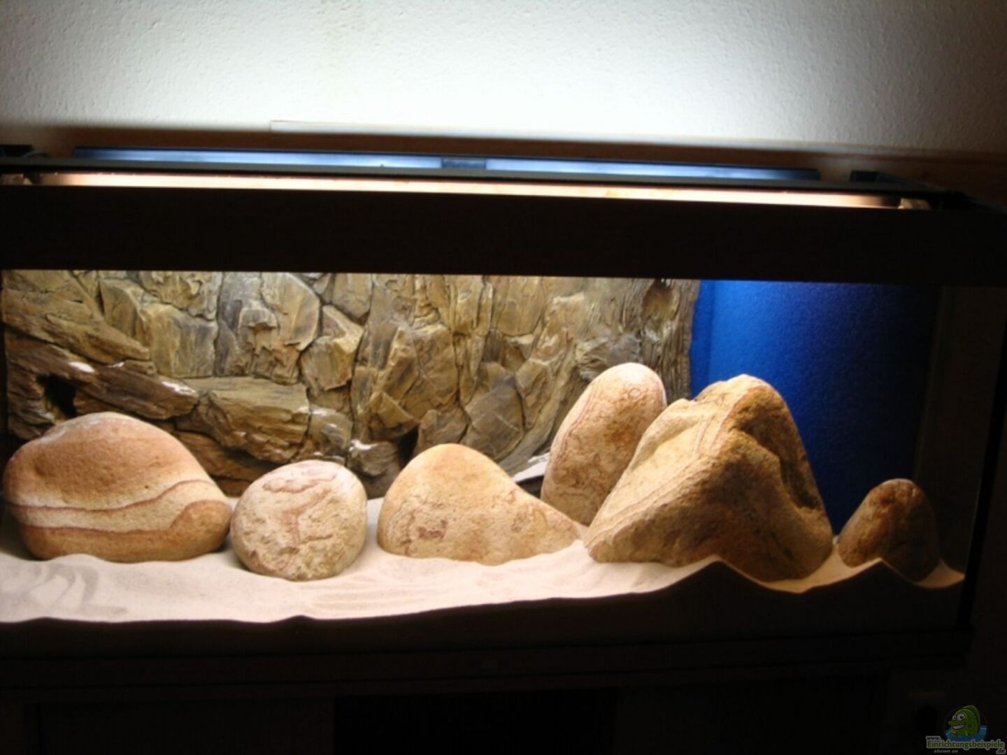 Die Steine liegen auf 2 cm festem Styropurplatten. Und sie wurden untereinander mit Aquariumsilikon verklebt (Ist zwar sicher, aber Fische fangen wird dadurch zur reinen Nervenprobe).