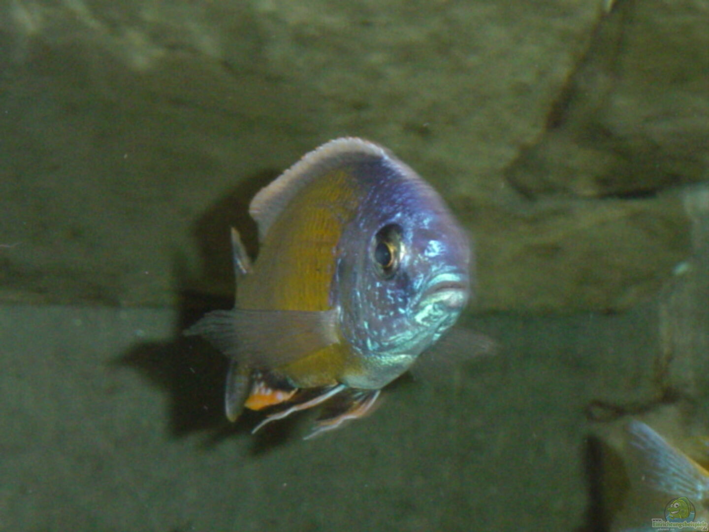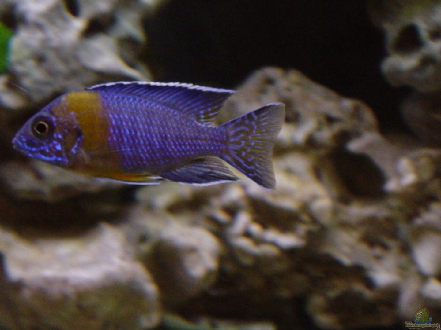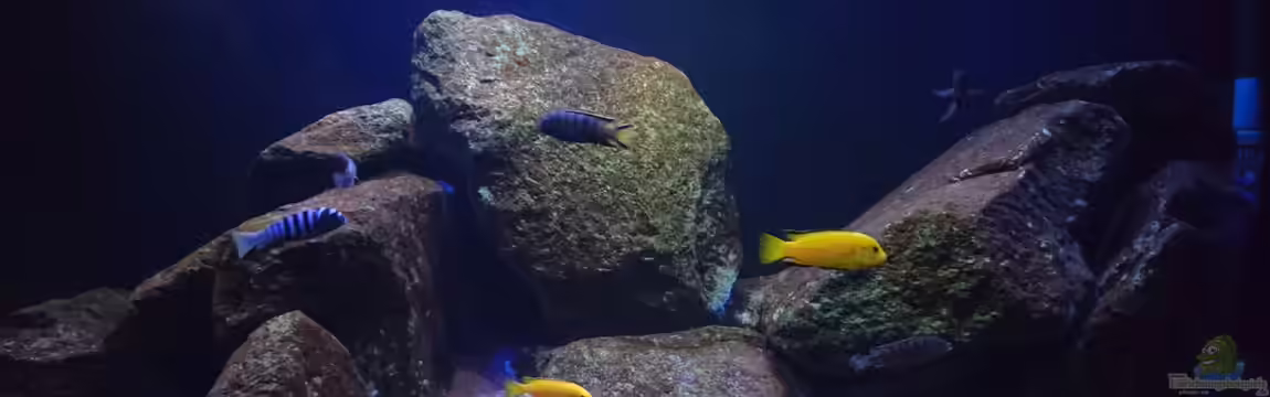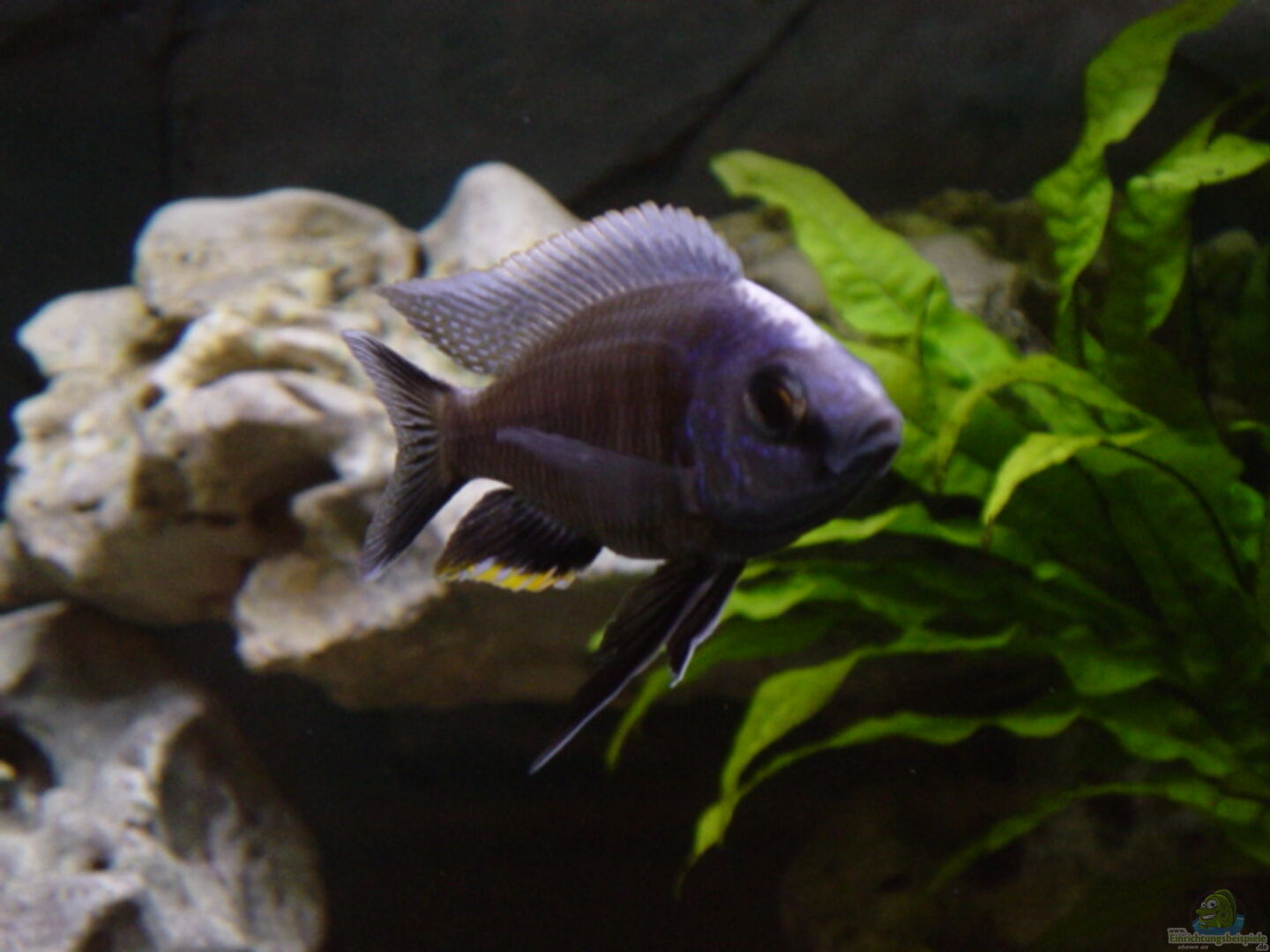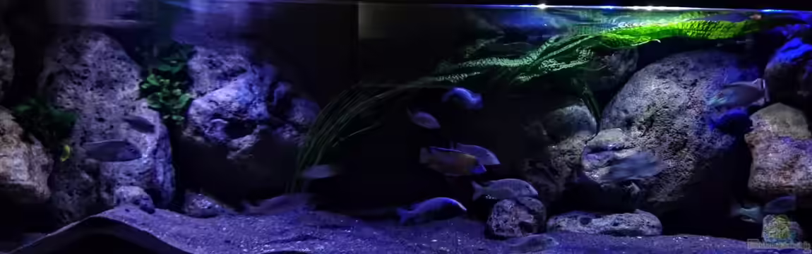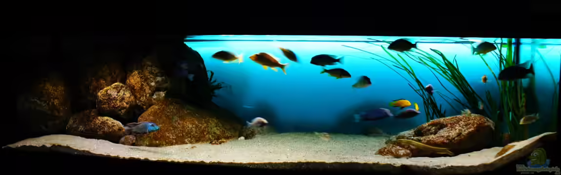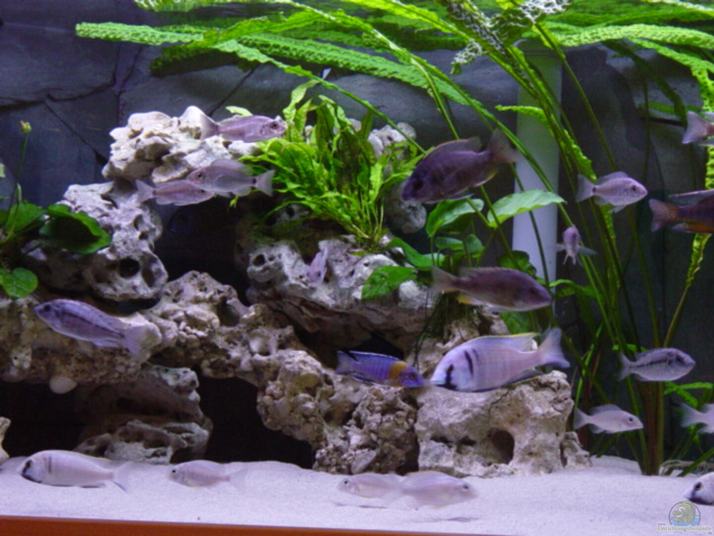 Da dies kein Mbunabecken ist wurden nur relativ wenig Steine eingebracht um den Fischen viel freien Schwimmraum und ausreichend Sandfläche zu bieten.Die Rückwand wurde mit dunkelgrauen, fast schwarzen Schieferplatten beklebt, was einen schönen Konstrast zur restlichen Einrichtung ergibt.