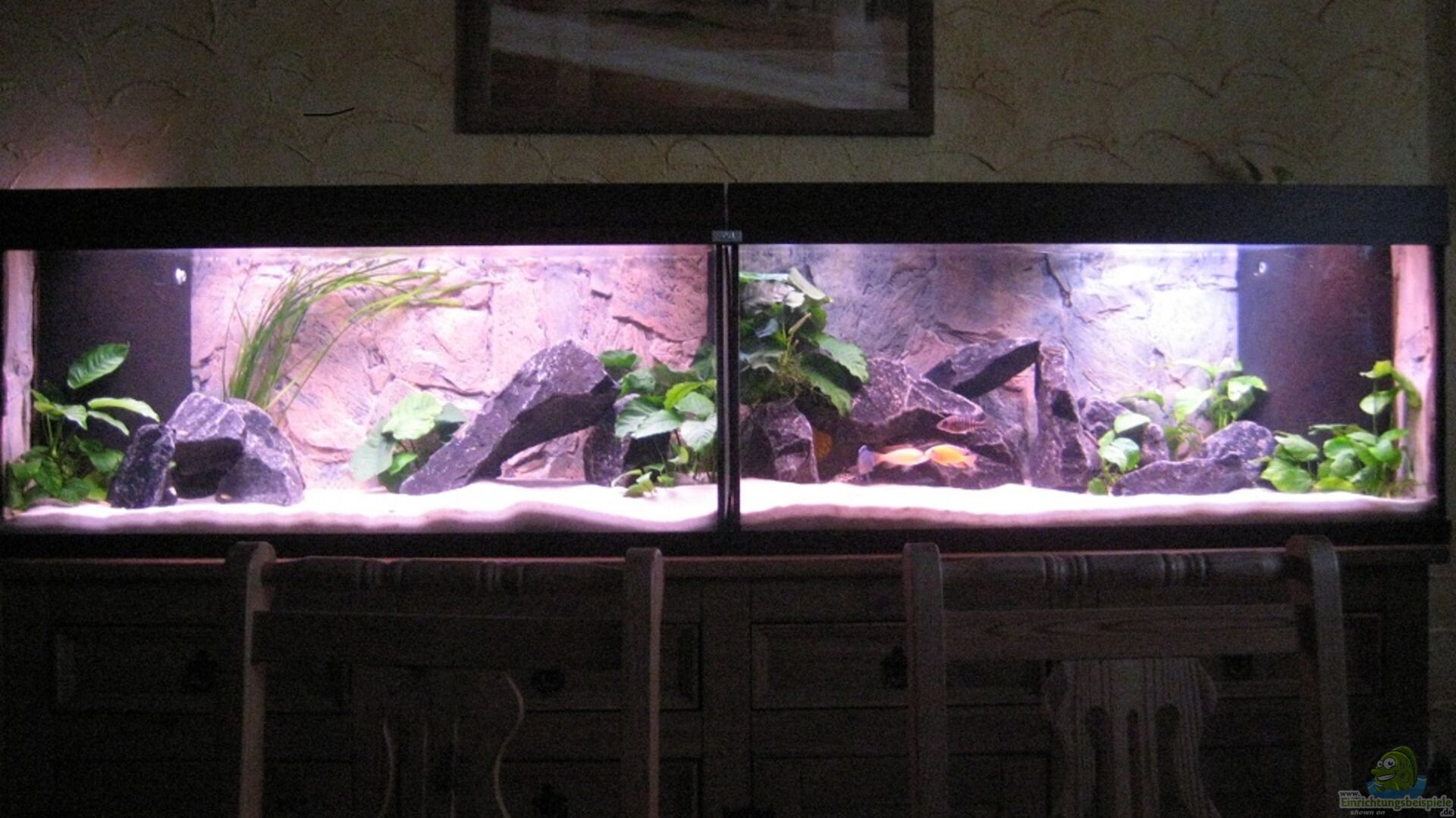 Aus zwei mach eins. Es handelt sich hier um 2 Becken der Marke Juwel Rio 180 beide Becken wurden in einem Online Auktionshaus ersteigert. Beide Becken wurden mit einer selbstklebende Mahagonifolie beklebt. So ensteht der Eindruck, es handelt sich hier um ein Aquarium.
