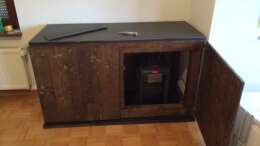 Der Aquariumschrank wurde von mir selber gebaut aus holzbalken 6x6 cm und multiplexplatten. Danach wurde er in Mahagoni lasiert und die Türen angebracht. Er hat 2 Türen wo die Technik und das Zubehör untergebracht ist.