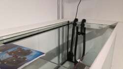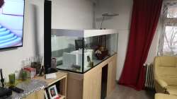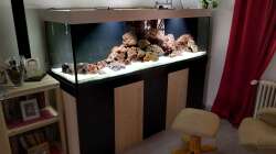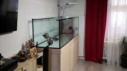 Nach Jahren mit fertigen Komplettsystemen habe ich mich dazu entschlossen bis auf Becken alles selber zu bauen. Der Unterschrank besteht aus 70mm Kantholz über Winkel verbunden. AlsVerkleidung dienen Leimholzplatten. Die Abdeckung besteht aus PVC Hartschaumplatten, silikonverklebt. Dessweiteren sind Hohlkammerplatten als Abdeckung verwendet worden. durch die gute Lichtdurchlässigkeit können die LED Fluter drauf gesetzt werden und nach belieben positioniert werden. eine Futterlucke ist ebenfalls installiert was der deckel eine Schaschlikdose war.
