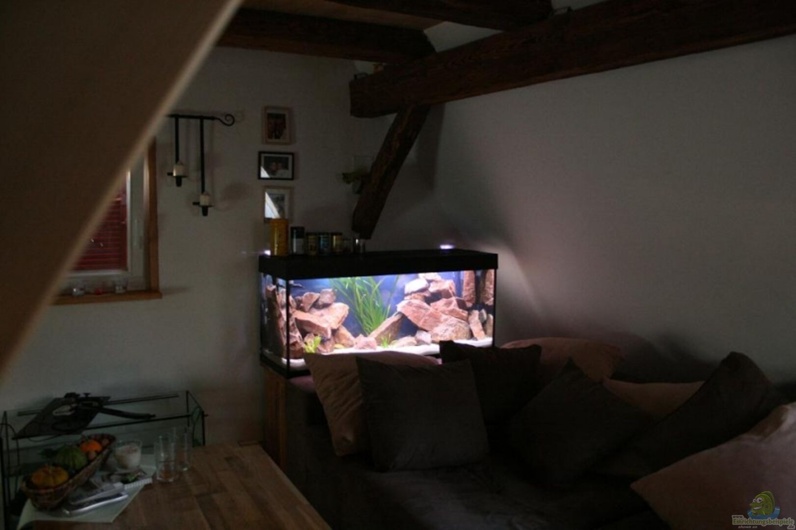 Das Becken steht auf einem ma??angefertigtem Unterschrank aus geöltem Kirschholz. Hat mir ein Hobbyschreiner gemacht. Schade nur das man ihn nicht wirklich sieht. Die Ma??e betragen 120x40x57. Durch die Höhe ist das Aquarium auf armlehnenhöhe des Sofas und wenn man sich gemütlich aufs Sofa knallt und ins Becken schaut muss man sich beherrschen um nicht einzuschlafen :-D