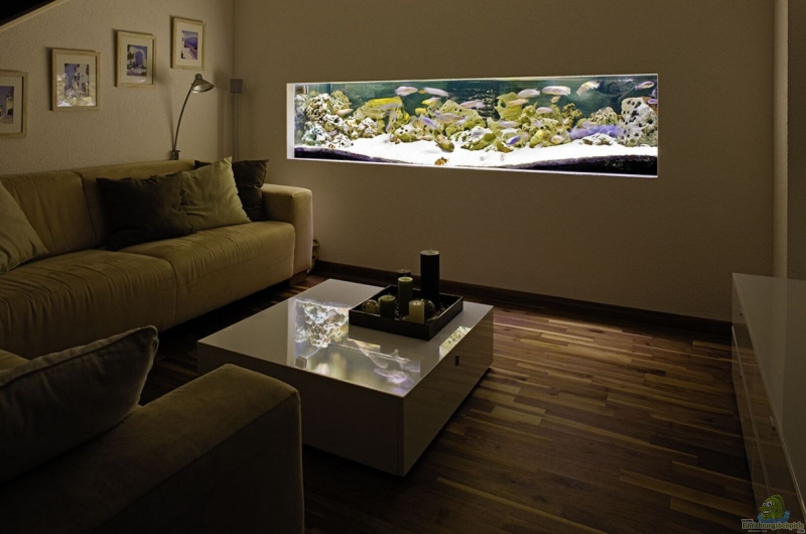 AQ in eine Wand des Wohnzimmers eingebaut. Der Technikraum befindet sich dahinter, mitsamt 4x 120L Zuchtbecken. Selbstgebaute Rückwand (Stil ´Granitwand´) aussen angebracht.