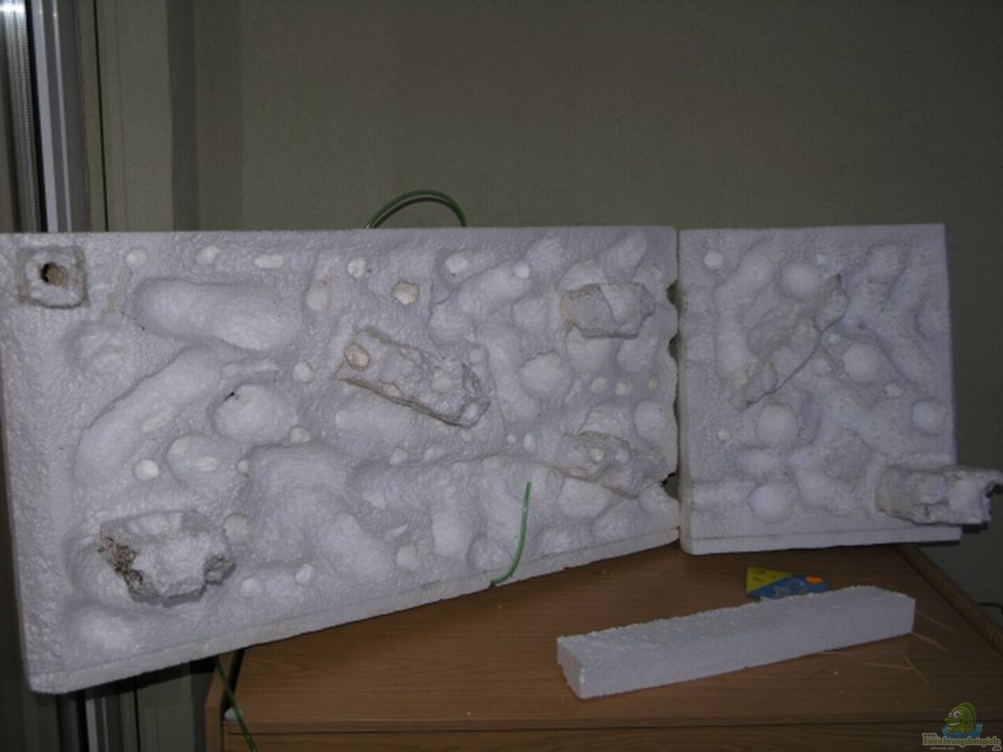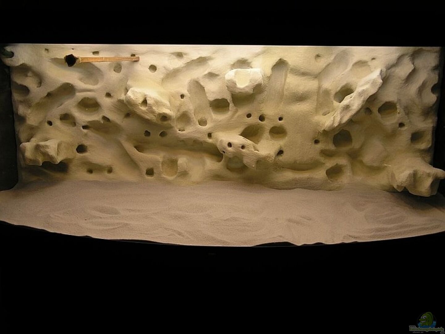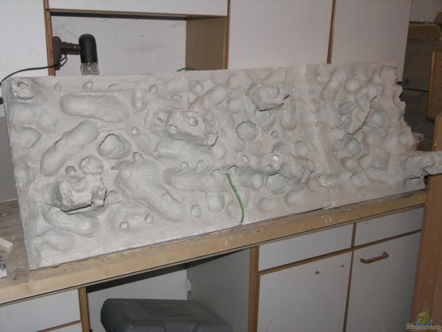 Selbstgebastelte Rückwand aus Weisszement.Die 2 Ansaugkörbe sind rechts unterm Stein versteckt in der Rückwand.