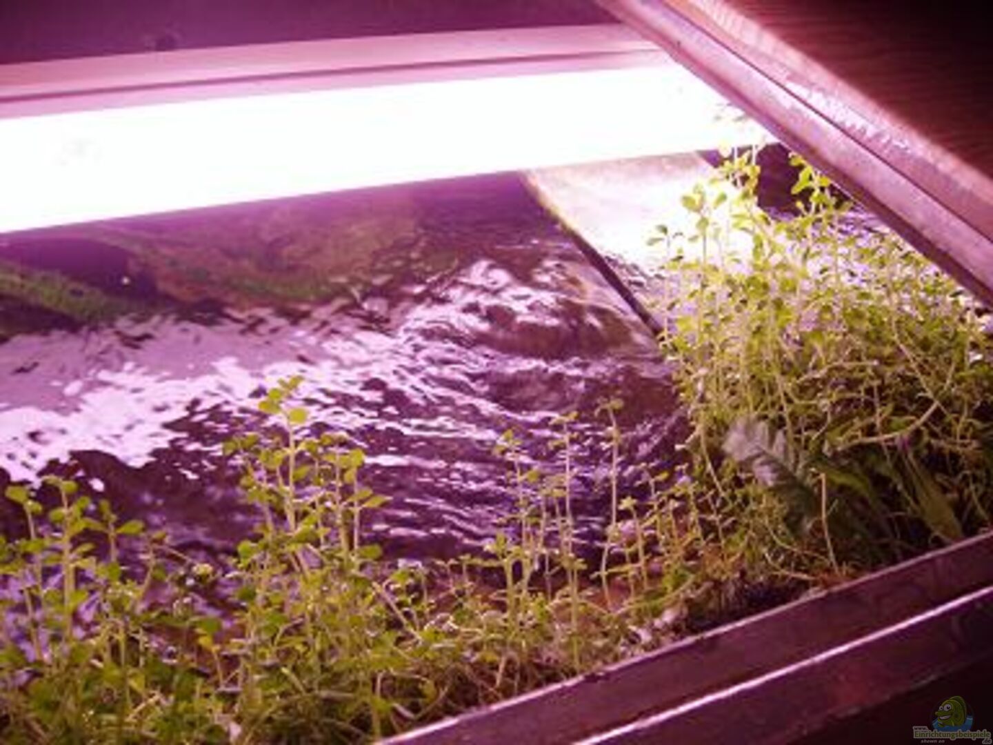 Links und rechts 1 x Filter mit je ca. 18Liter Volumen , jeweils Glasscheibe 45° über Eck verklebt, Filtermaterial grober blauer Filterschwamm, je 1 x16 W Pumpe sitzt im Filter unten , Ansaugen von oben.