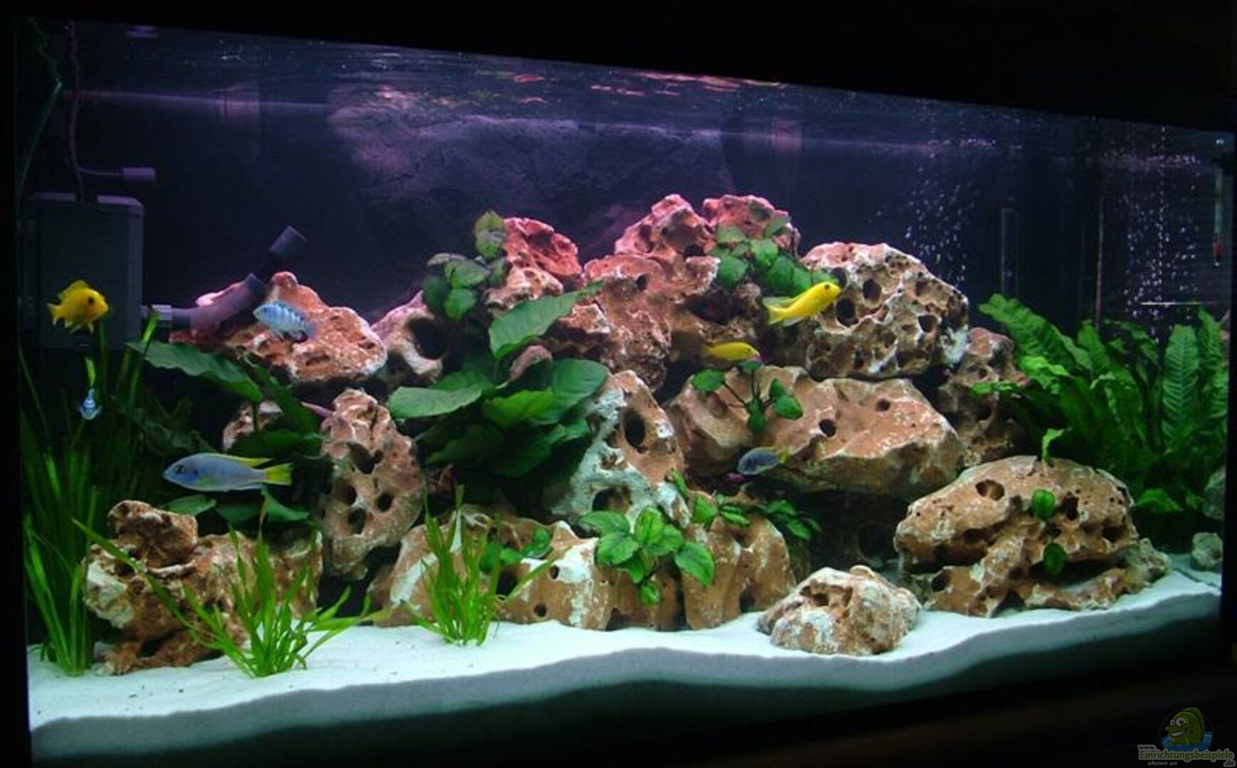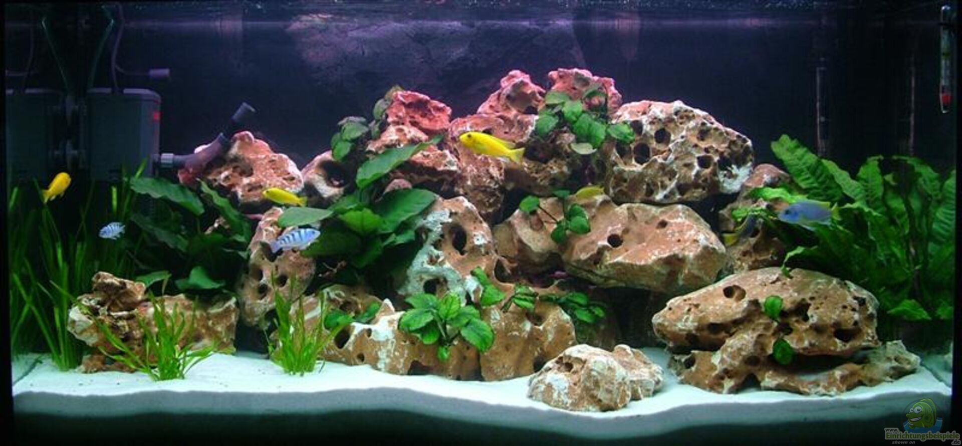 ca. 55 Kg afrikanisches Lochgestein wurde so aufgebaut das den lebendigen Mbunas sehr viele Höhlen zu Verfügung stehen, und dennoch genügend freier Schwinnraum im vorderen Teil des Beckens übrig bleibt.