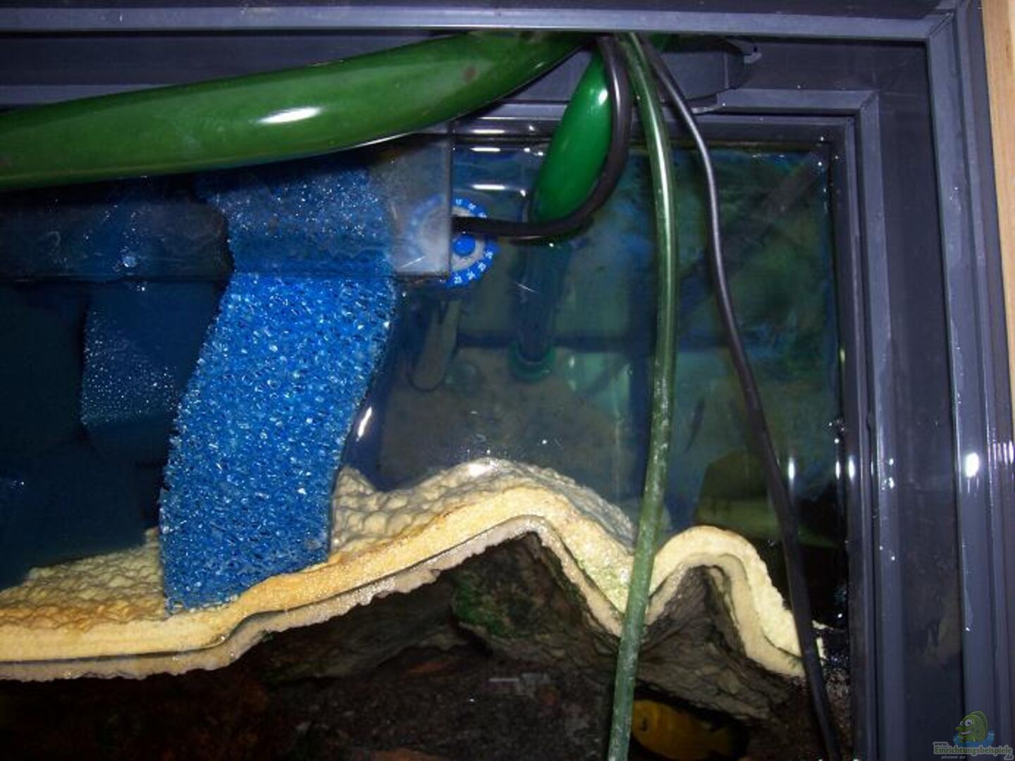 Der Zwischenraum von Rückscheibe - Fels-Rückwand, (welche mit Silikon eingeklebt wurde) ist bestückt mit ca. 4 x 4 x4cm gro??en groben und feinen Schaumstoffwürfeln. Dieser Filter wird mit Eheim Innenfilter 2252(Pumpenleistung 1200 L/h) betrieben.