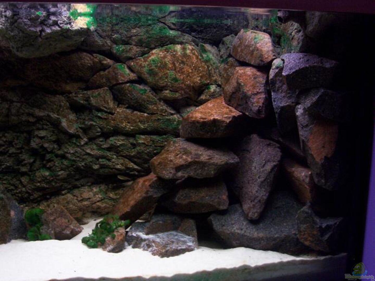 ca. 100kg Granit Wasserbausteine zu 2 Geröllhaufen aufgebaut; stehen auf 1cm dicken Styropor und 1cm dicken Plexiglas. Dadurch ergeben sich viel Höhlen, die teilweise abschlossen sind, teilweise aber auch durchschwommen werden können. 2 Back To Nature Modulsteine am Mittelsteg befestigt.