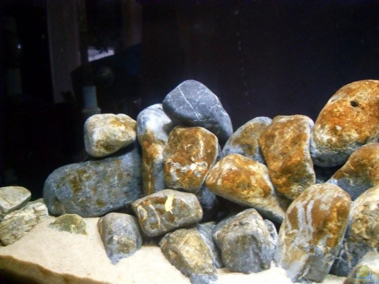 ca.80 Kilo Gestein aus dem Baumarkt, welches sich nicht so einfach stapeln lässt. Würde gern nachträglich mehr einbringen, jedoch wei?? ich nicht so recht wohin mit den Fischen. Desweiteren wollte ich die Steine ungern an die Seitenscheiben lehnen.