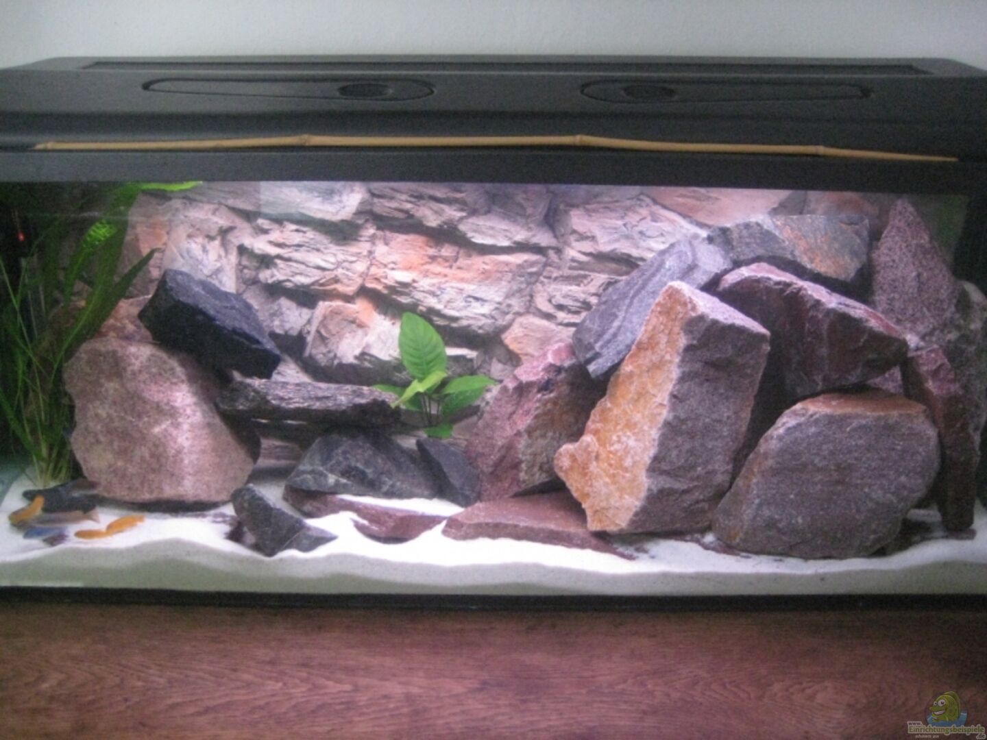 Standardbecken mit Wromax-Abdeckung, 3D-Rückwand, Aquarium sieht auf Pics heller aus als in natura