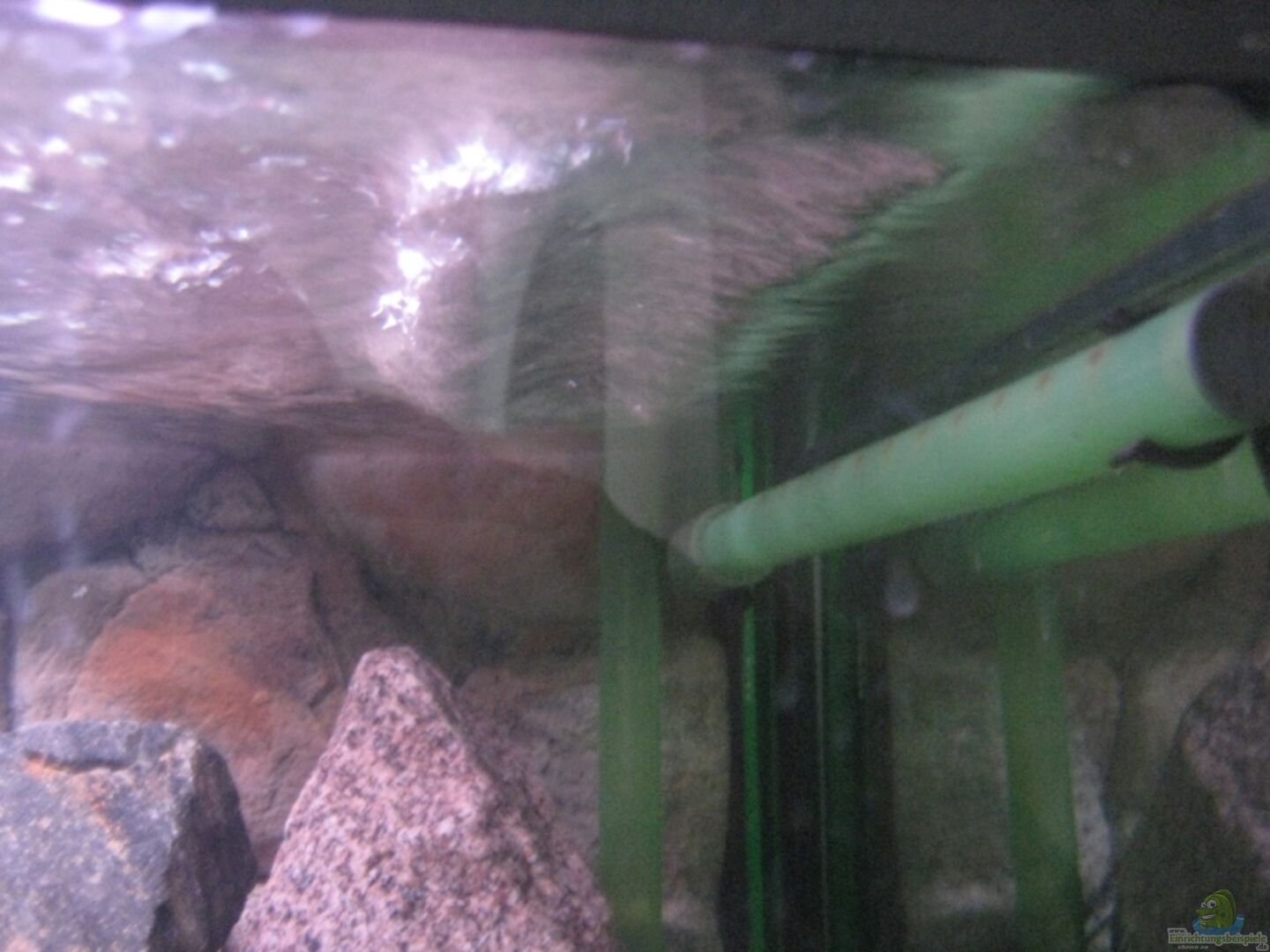 Eheim: Ansaugrohr ebenfalls auf rechter Seite, Ausströmrohr (Rohr mit Querschnittverengung) von Rückwand kommend ca 15cm von linker Aquariumseite entfernt, Ausrichtung ca. 45° nach rechts unten (also ein wenig entgegen der Strömung des Jebao)
