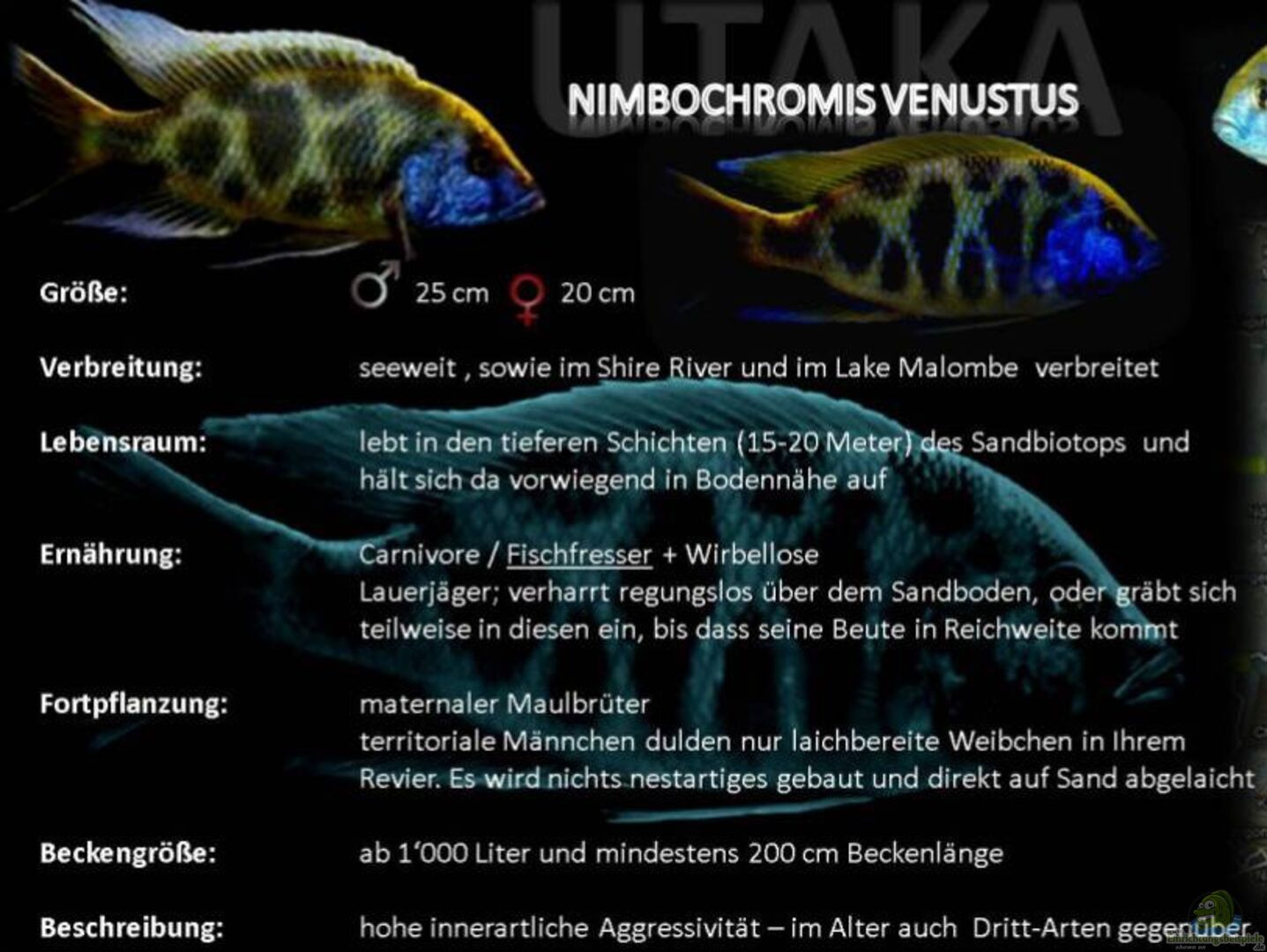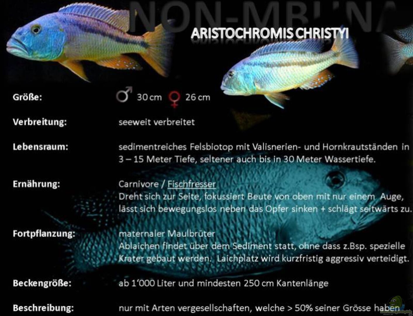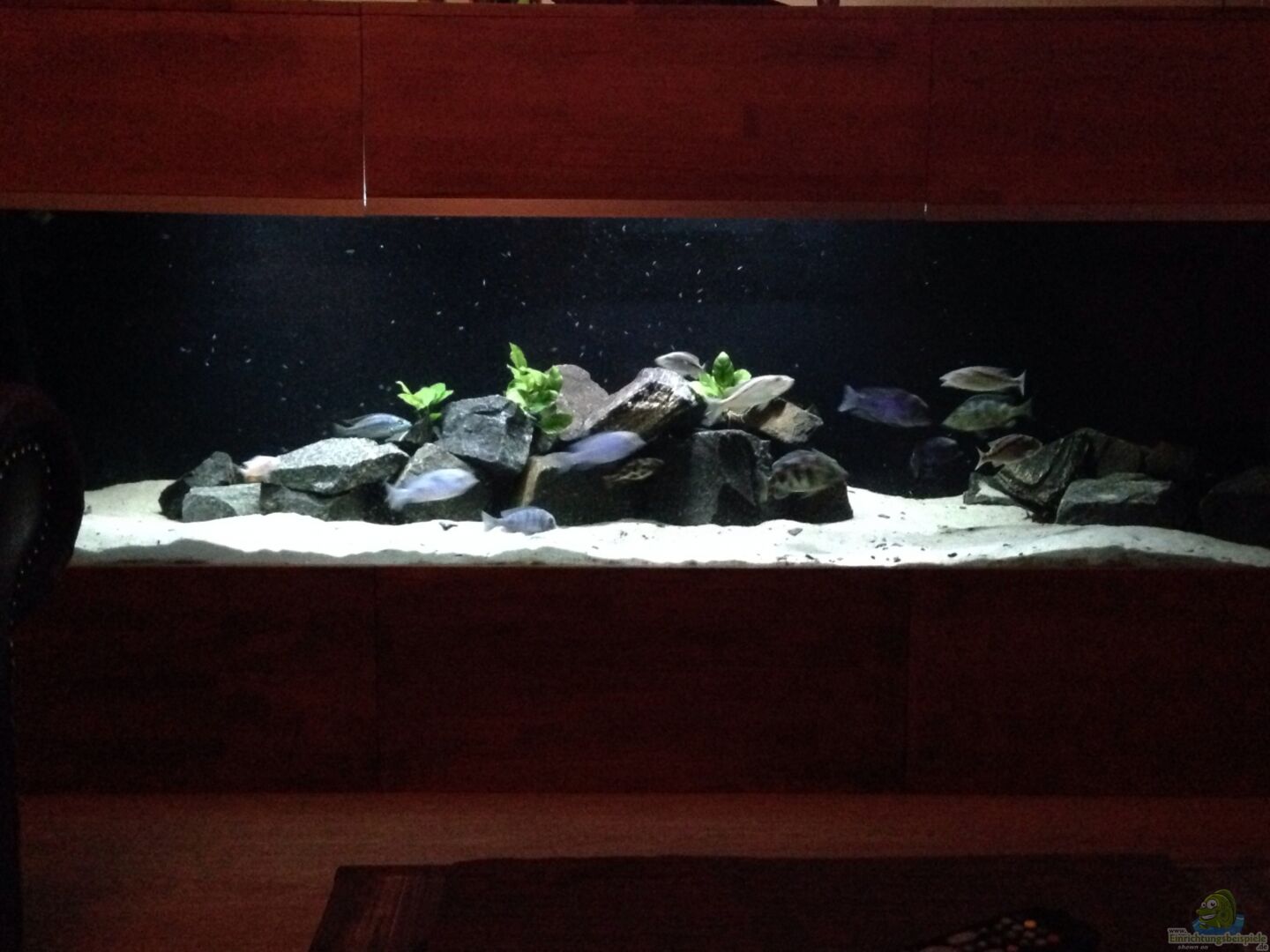 Was aber in meinen Augen gar nicht geht, ist die Besatzzusammenstellung.Du pflegst Mbunas, Non Mbunas und auch diverse Räuberarten.Die Beulenköpfe(Cyphotilapia frontosa)wei?t du ja selber, das die gar nicht passen, aber die la? ich jetzt mal au?en vor.