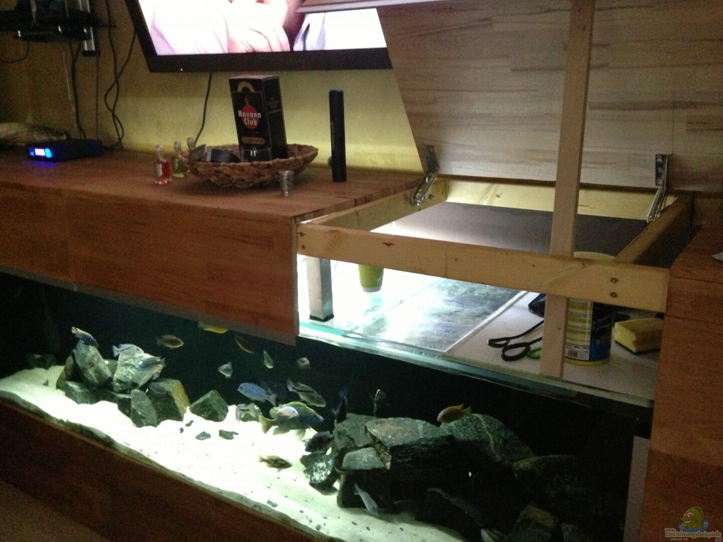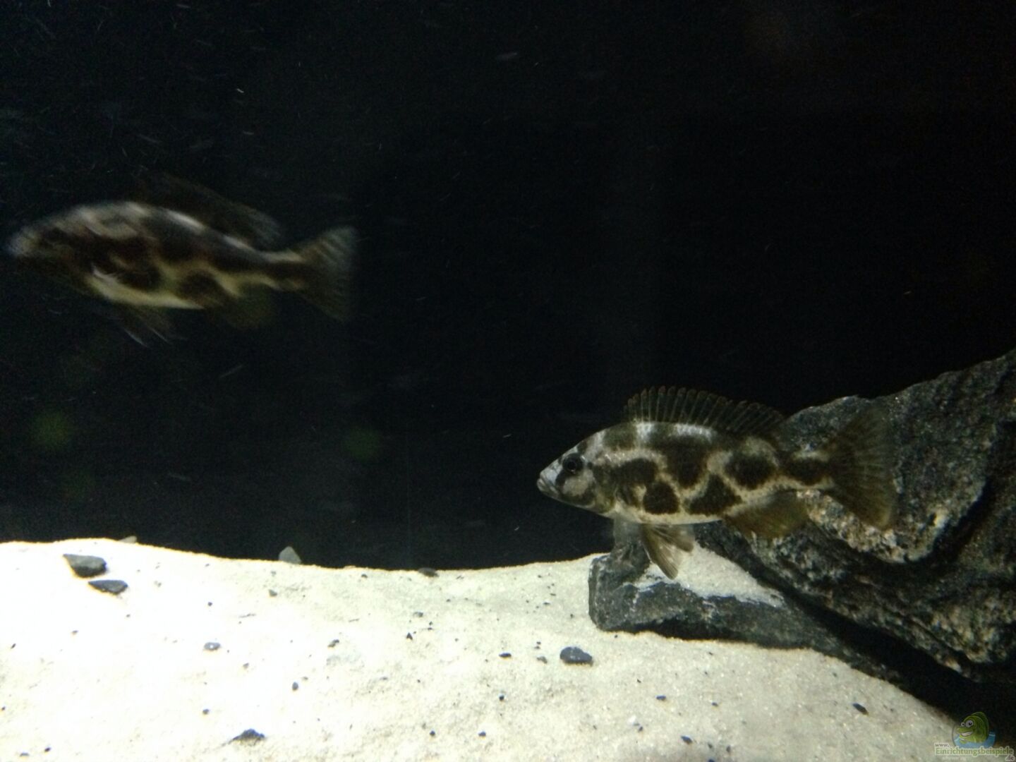 Alleine die 2.30m Kantenlänge, lassen schon einiges zu, bei Gestaltung u.Revierabgrenzung.Die Filterung und Beleuchtung sind sehr vorbildlich, auch das Basalt-Gestein ist sehr gut gewählt.