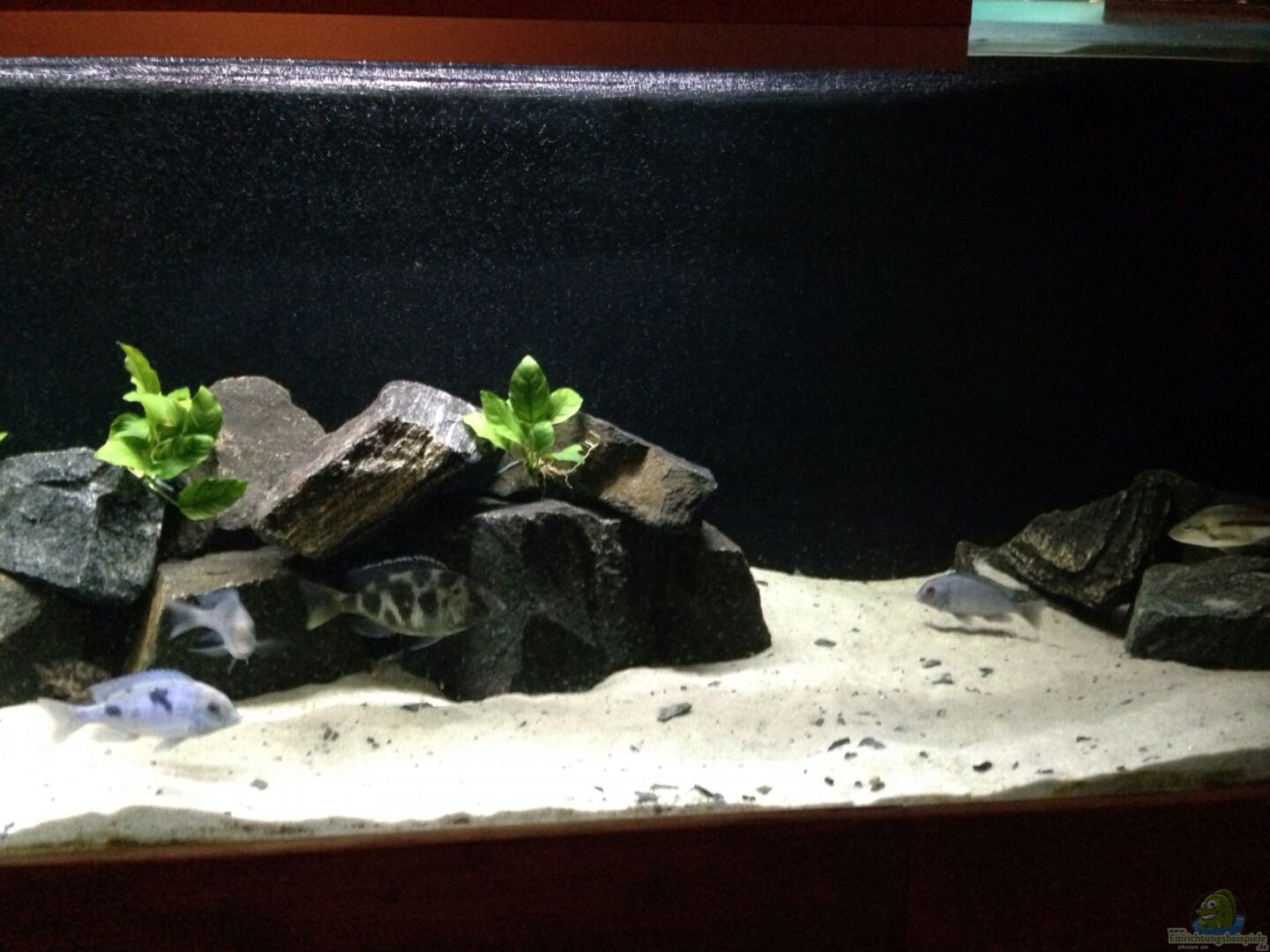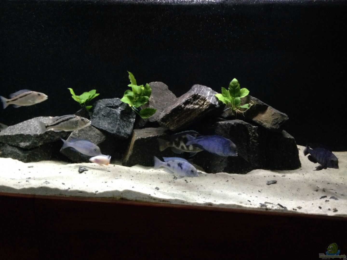 Die Mbunas ( Felsbebohner) müssen viel mehr Steine haben, die auch viel höher gestaltet werden mü?ten, und vor allem ernähren sie sich auschlie?lich von Aufwuchs (also pflanzlicher Kost).Ich hoffe du informierst dich mal genau, und änderst dann mal einige Sachen, dann wirst du in Zukunft viel freude mit diesem klasse Aquarium haben.
