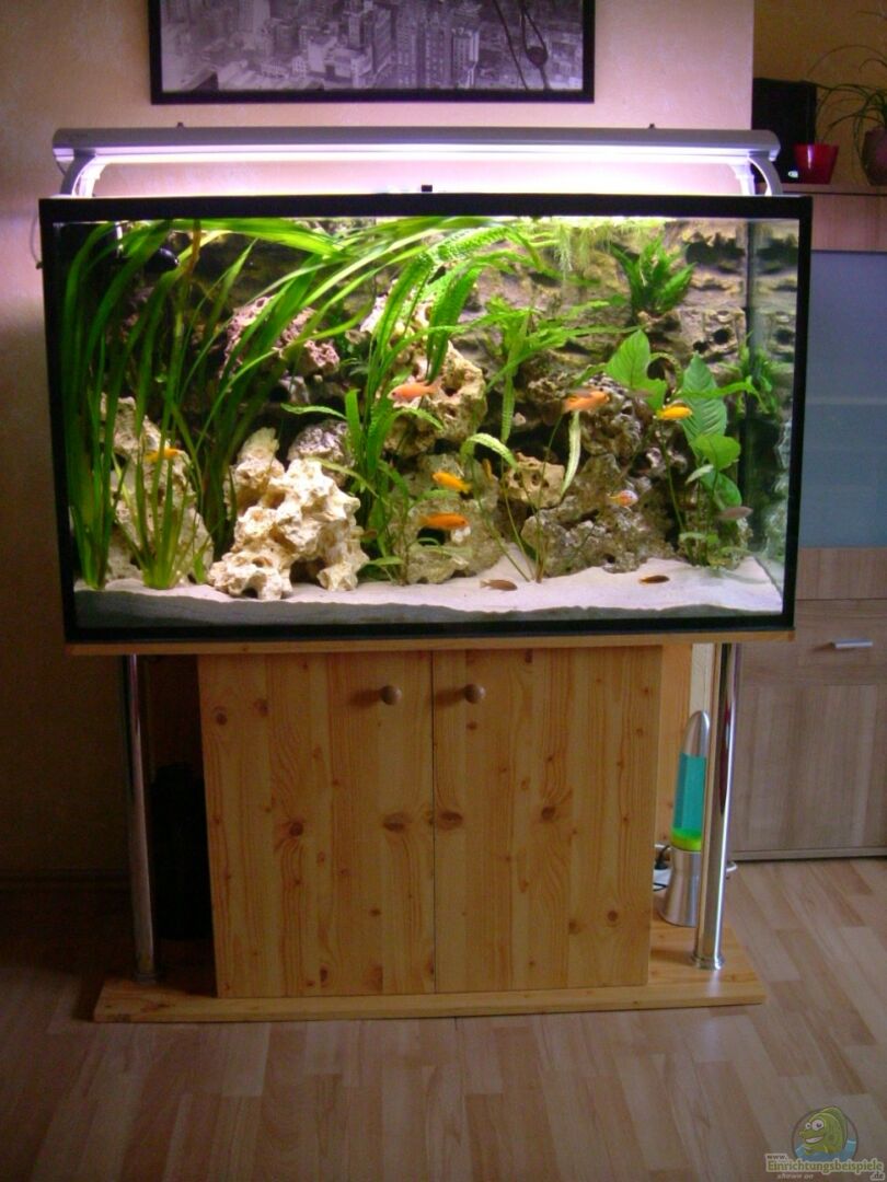 das Becken ist eine Sonderanfertigung (12mm Glas) mit eingebautem 3-Kammer filter (42 liter Filtervolumen)Komplette abdeckung vom Becken aus Glas.
