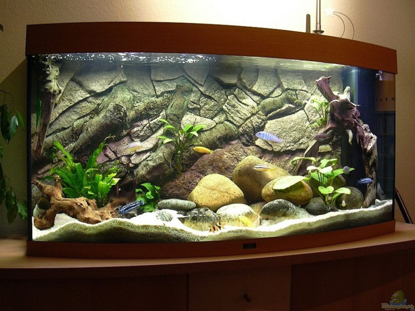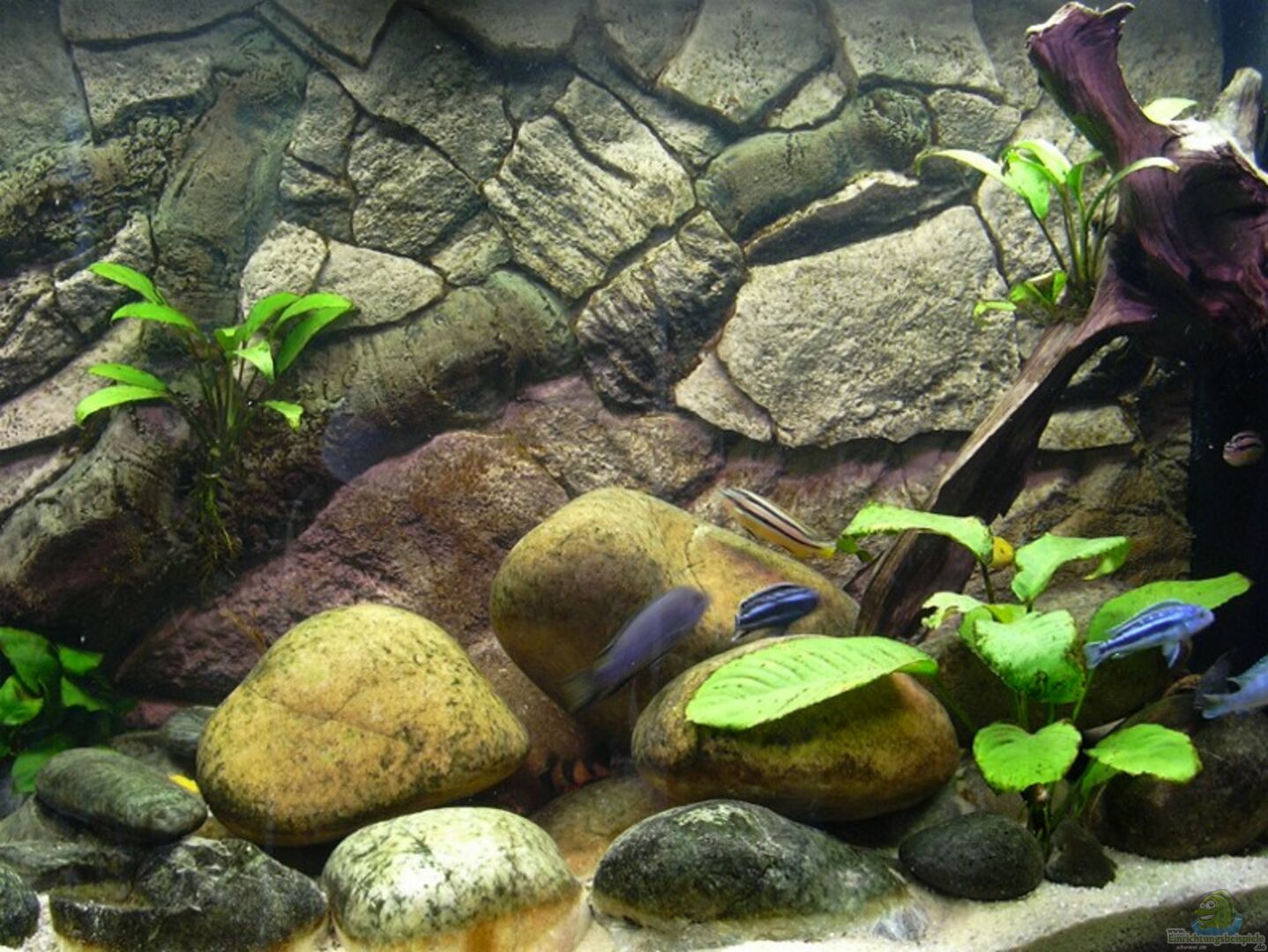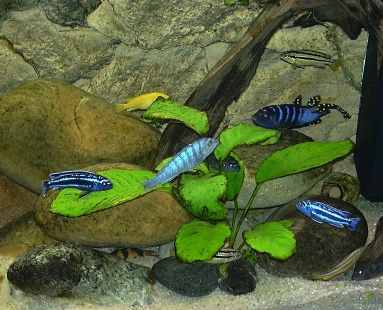 Rote Mückenlarven werden meist in belasteten Wasser gezüchtet, daher sind diese für Malawies völlig ungeeignet. Cyclops oder Artemia ist Frostfutter erster Wahl. Die Wurzeln sollten bis auf ein kleines Stückchen aus dem Aq. entfernt werden da diese das Wasser ansäuern. Ein kleines Stück reicht für den Zellulosebedarf des L-Welses. Botia macracanthus kenne ich nicht. Ansonsten ein vorzeigbares Aquarium. Natürlich macht sich die Rückwand sehr gut, war ja auch teuer genug.