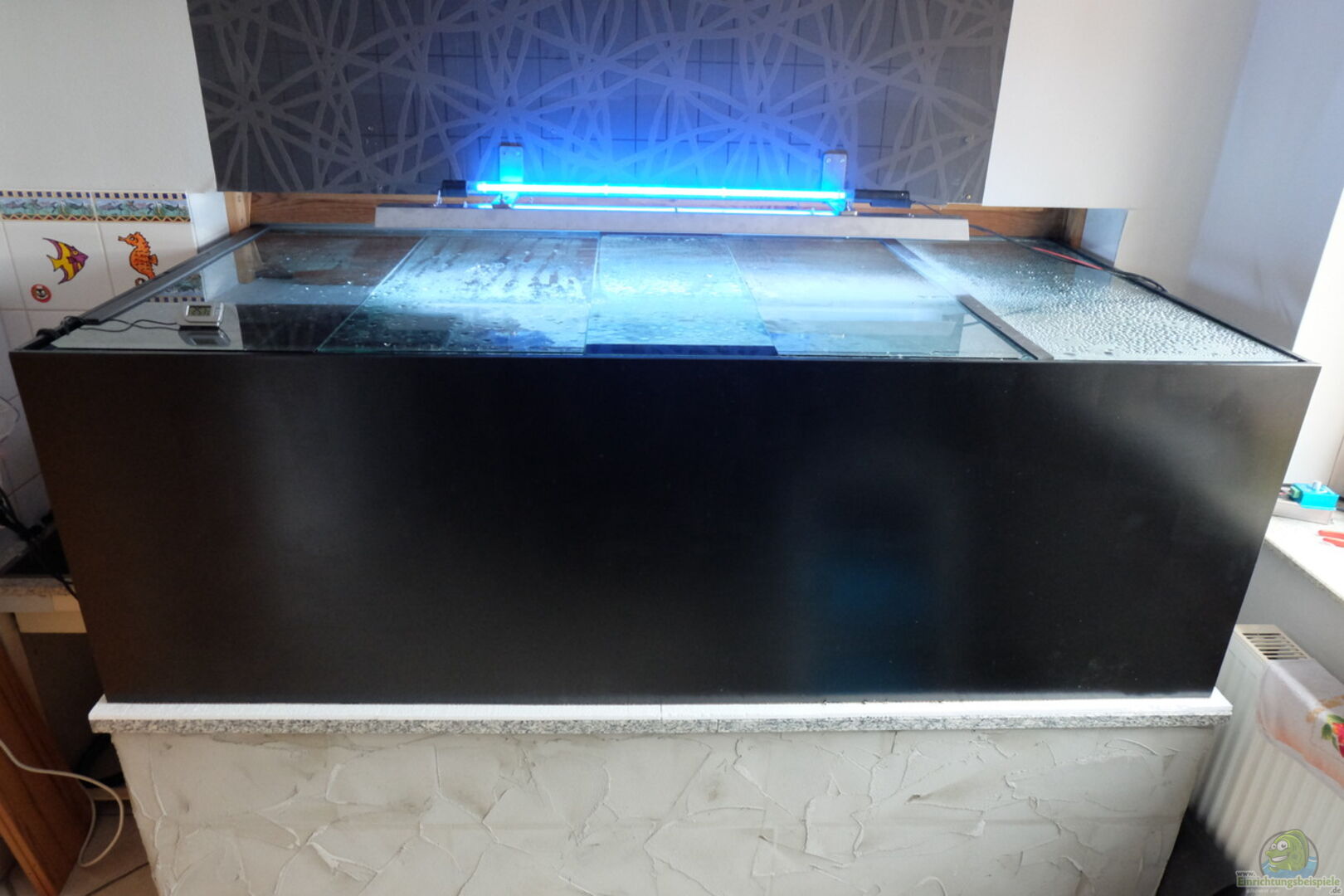 Becken ist in die Wand eingelassen.Es besteht Komplett aus 15 mm Glas.Rück und Seitenscheiben sind schwarz lackiert.Front in Weissglas. Danke noch mal an Aquarienbau Enningerloh!