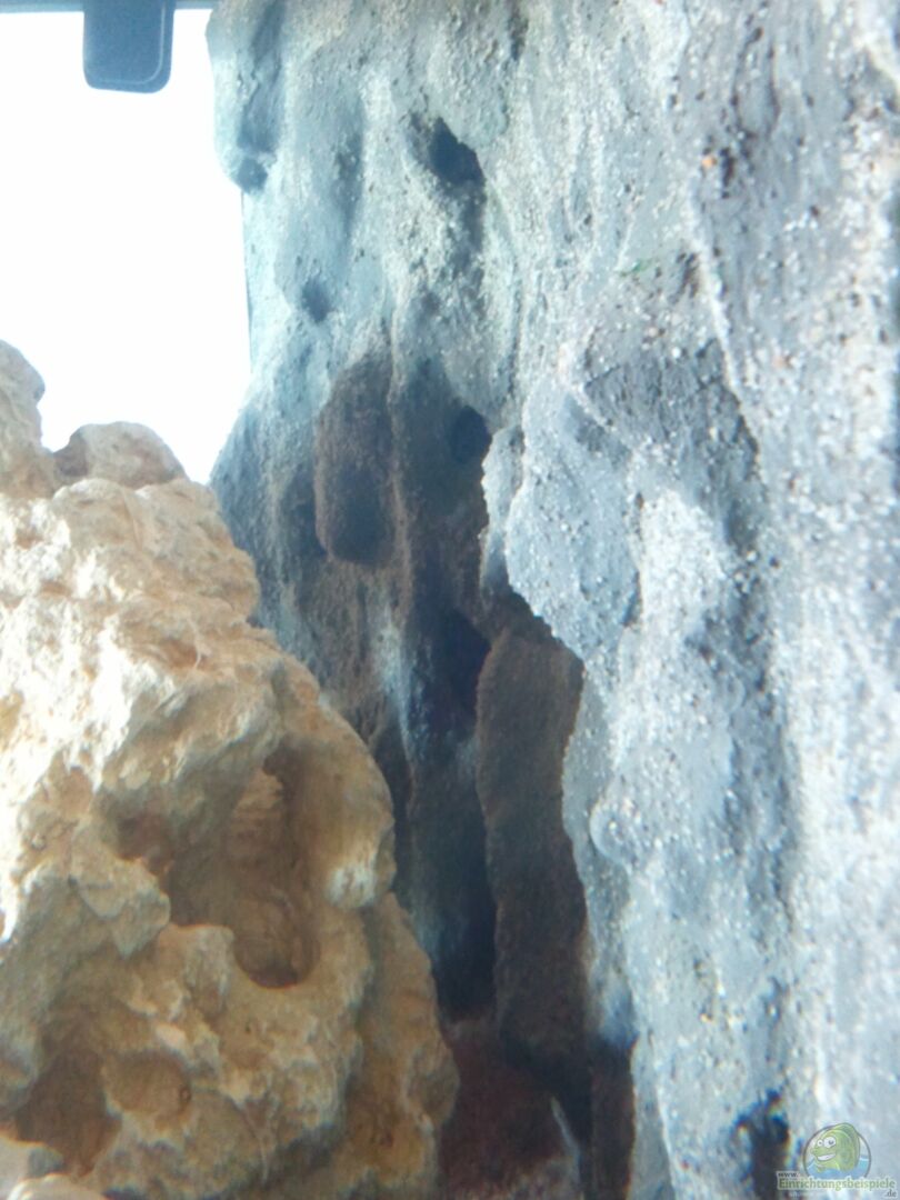 Selbstgemachte Rückwand aus Styropor, Aquariumsilikon und Cement. Zum Schluss habe ich diese noch mit Sand bestreut.
