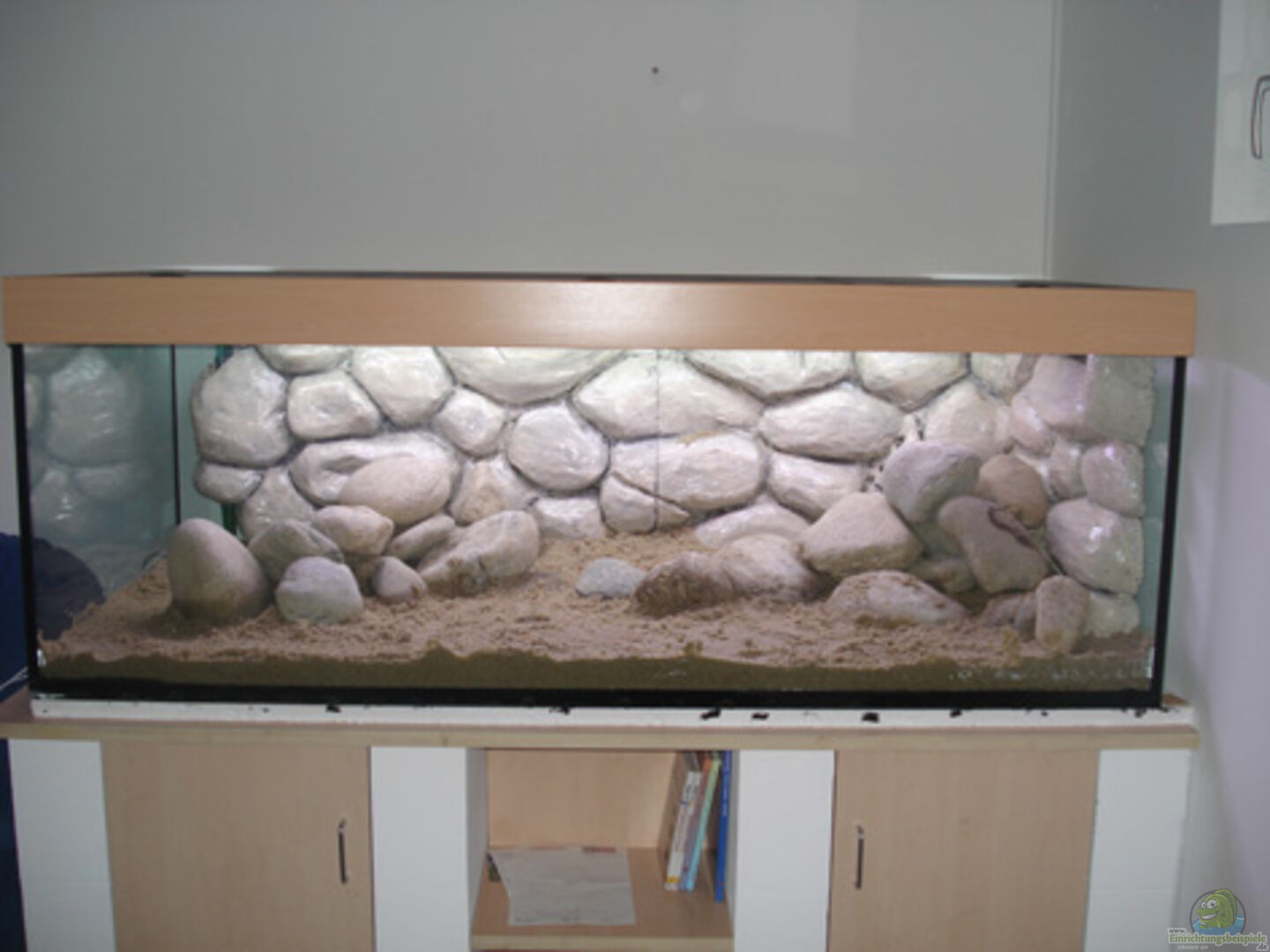 Bei einer Tiefe von 80 cm und einer Länge von 180 cm kommen bei mir genug Reviere und auch genügend freie Sandflächen zusammen. An den Fotos kann man wahrscheinlich die Menge der Steinaufbauten nich erkennen.