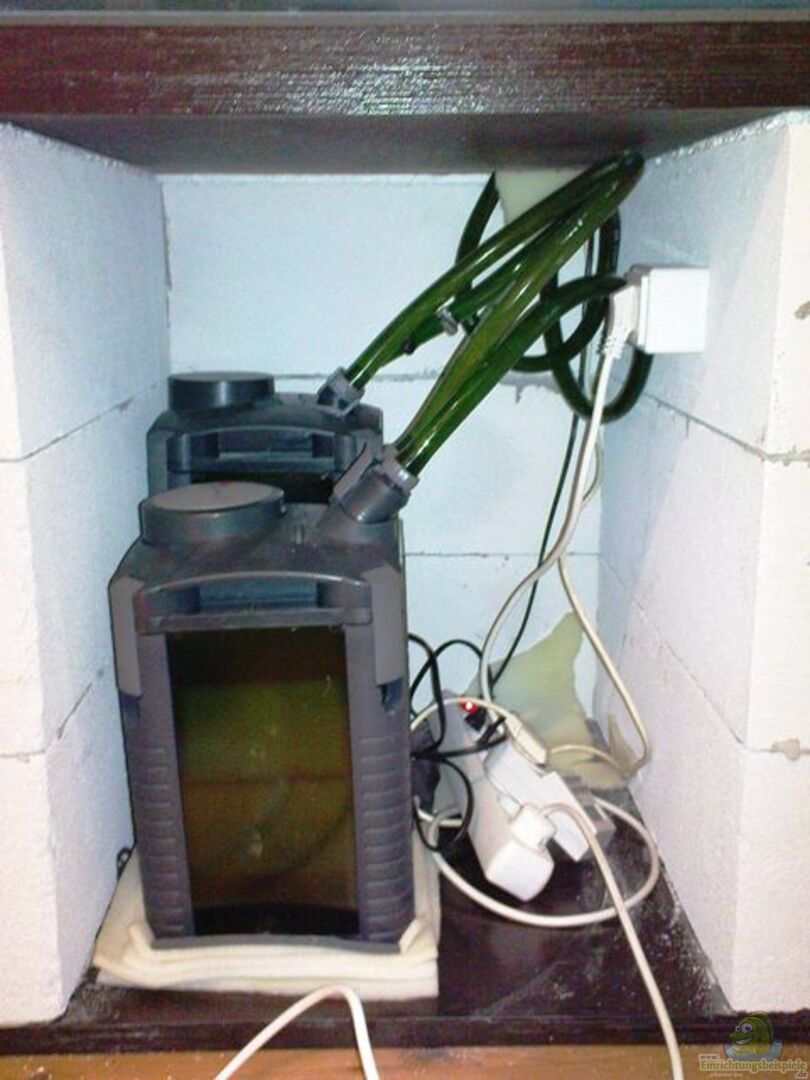 Eheim 2226 und 2028 in Reihe geschaltet, den kleineren als Vorfilter mit Matten gefüllt, den grö??eren als zweite Stufe mit Siporax