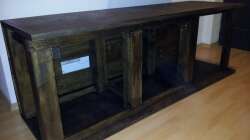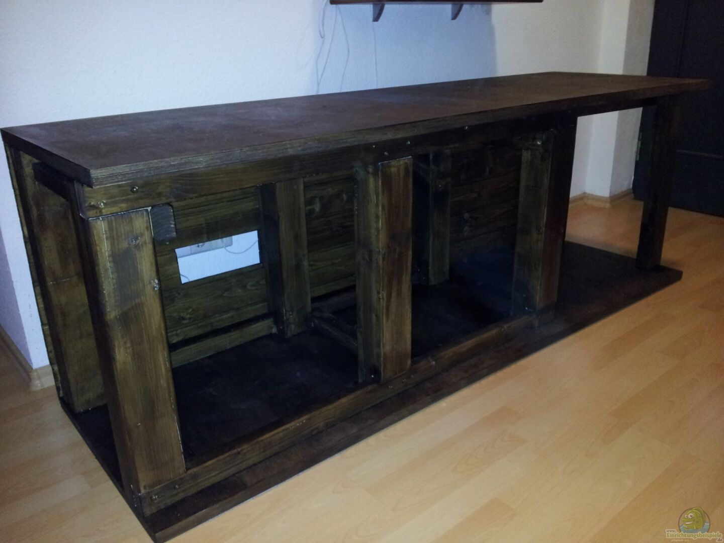 Untergestell ist selbstgebaut aus Kantholz und Leisten (4x6cm), die Boden- und Deckplatte sind 3cm starke Multiplexplatten.Das Gestell ist mit Palisanderinnenlasur behandelt.
