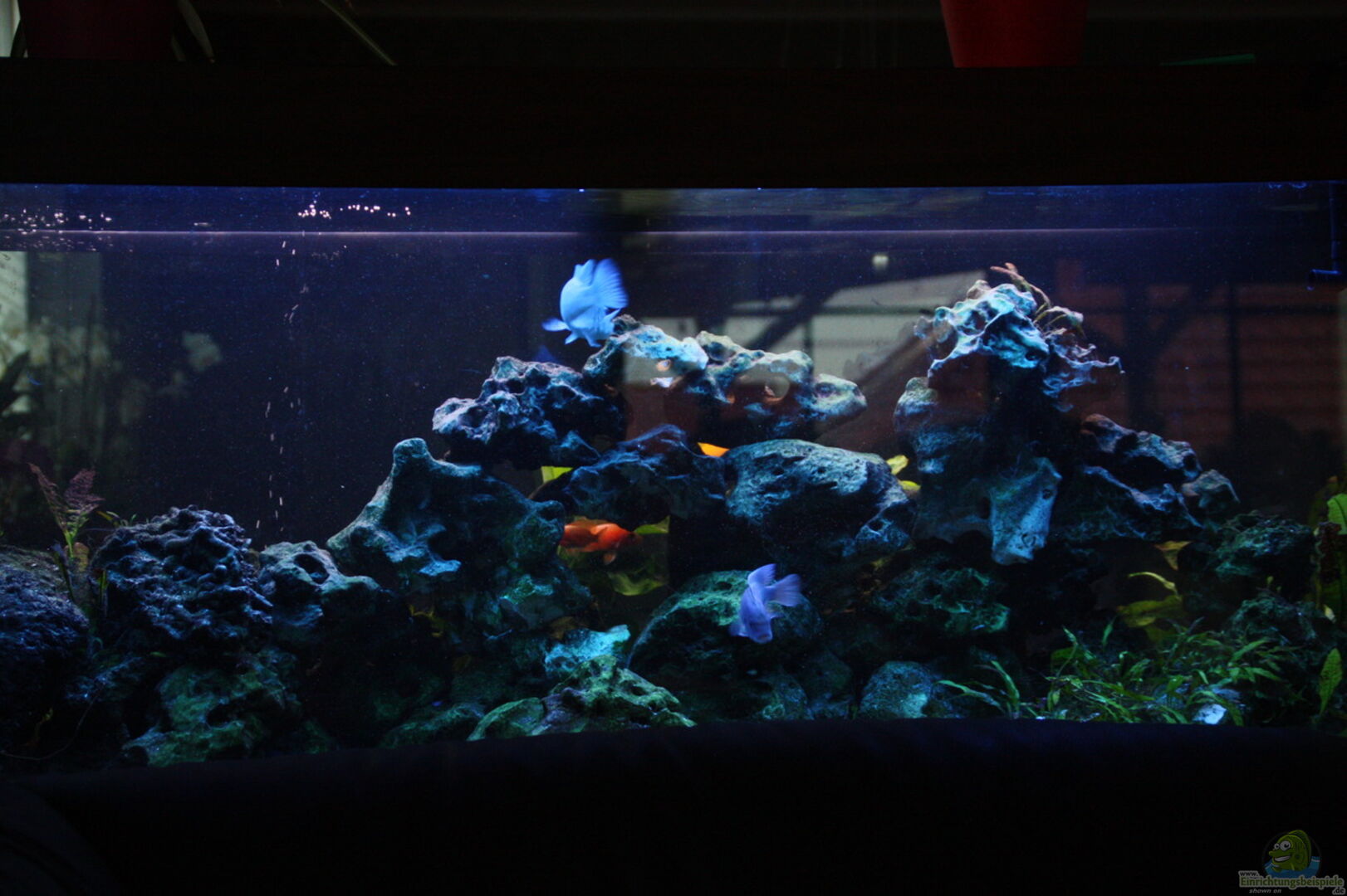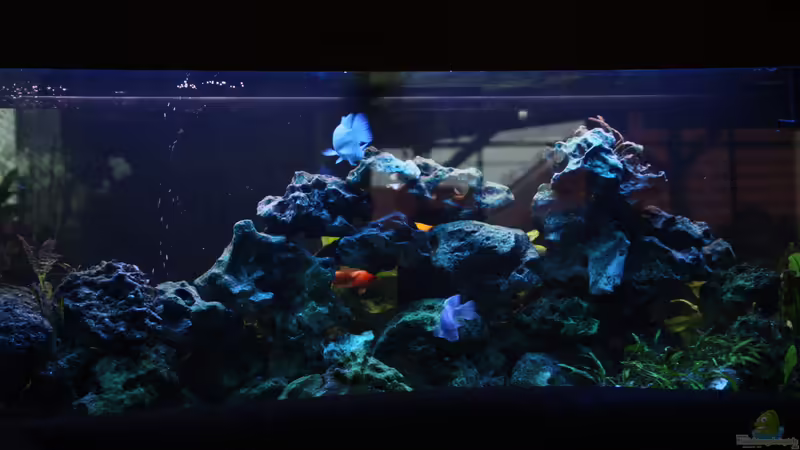 Beleuchtung momentan: 1x PowerGlo 40W und 1x MarineGlo 40W extrem blaue Leuchstoffröhre für Salzwasseraquarien.