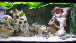 Künstliches Lochgestein in denen sich die Fische verstecken können. Weiterhin echtes Lochgestein und Flusskiesel.