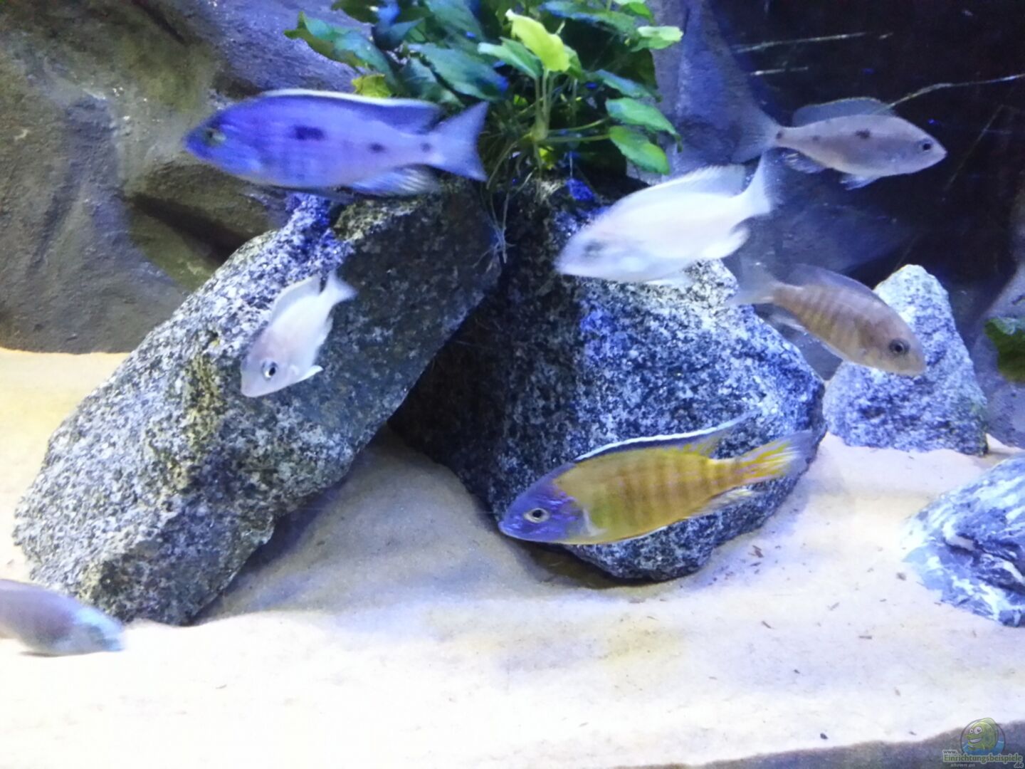 1/3 Copadichromis Azureus Jungtiere. Der Bock steht mit 5cm voll in Farbe. Wieviele Mädels es sind lässt sich noch nicht genau sagen, dieses Verhältnis ist geplant. Es sieht aber so aus, als wären es Damen.
