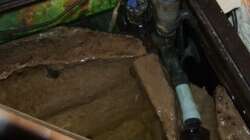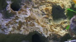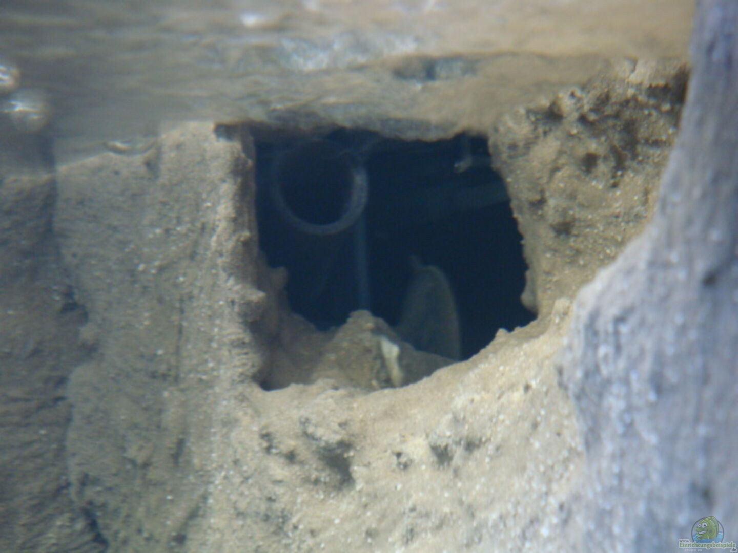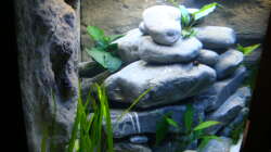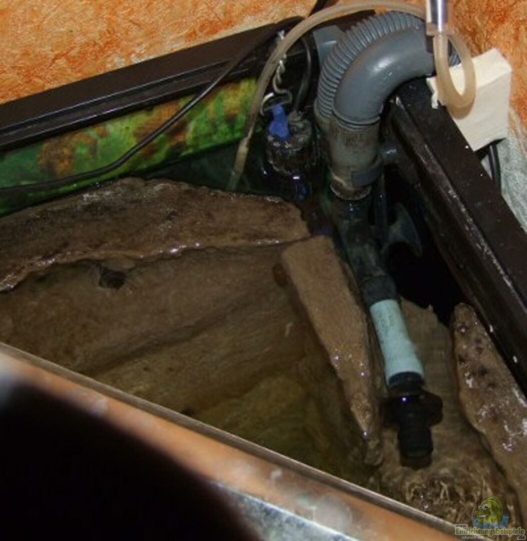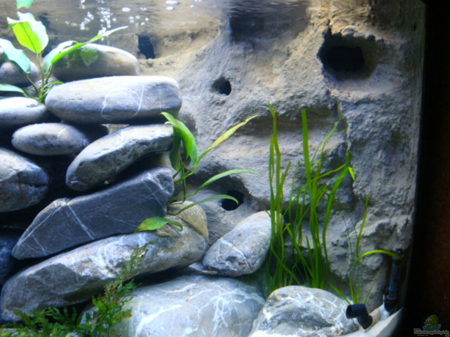 Rückwand Eigenbau aus 100er Styropur. Mit Hei??luftfön bearbeitet, Fliesenkleber beschichtet, darauf S7 Abdichtung von Ardex mit Farbe etwas abgetönt und leicht mit Quarzsand bestreut. In den Rückwänden befinden sich 4 gro??e Höhlen mit jeweils 3-4 Ein/Ausgängen und Aussparungen für die Technik (Filter Ab/Zulauf, Heizung, Luftschlauch).