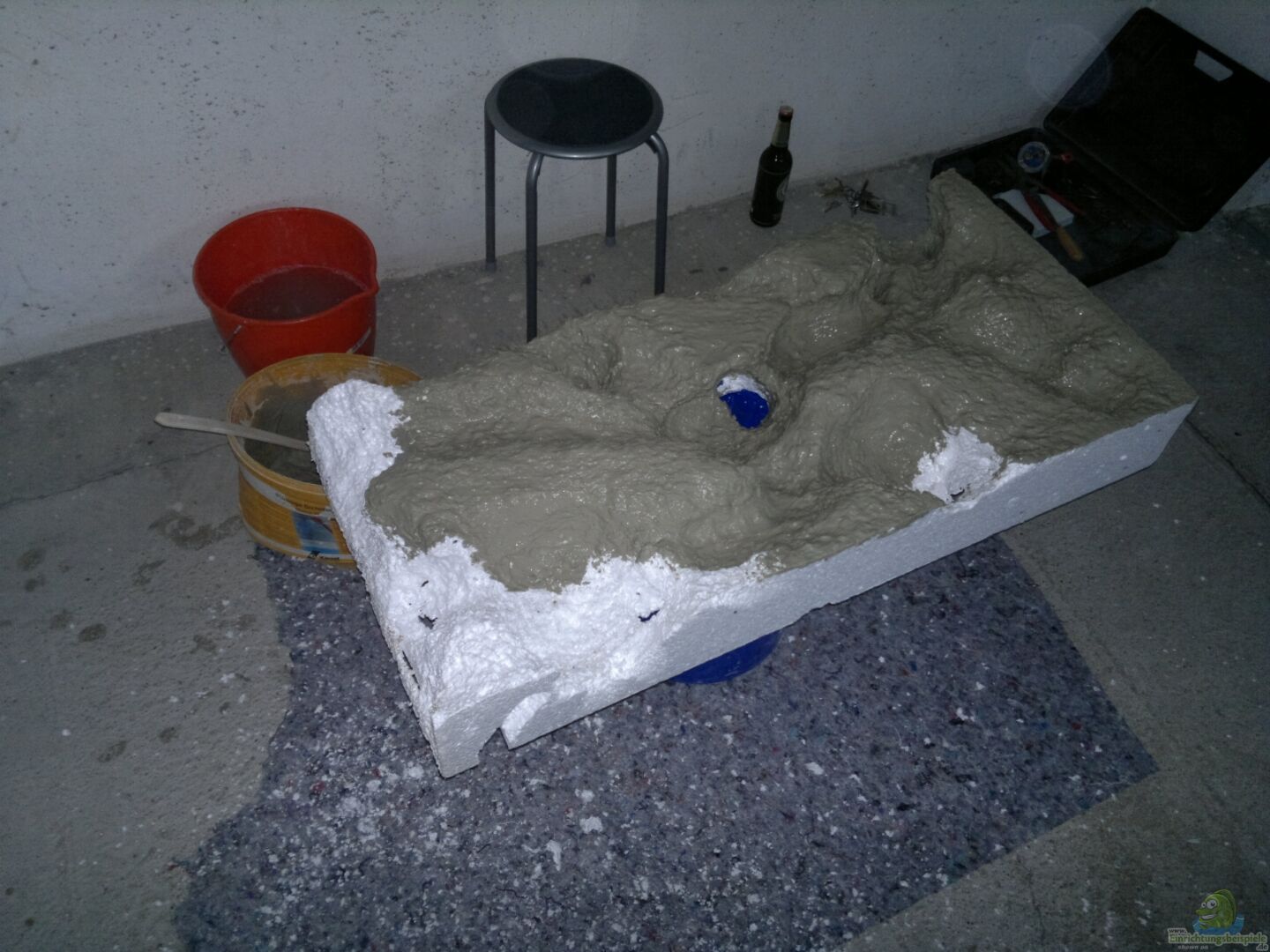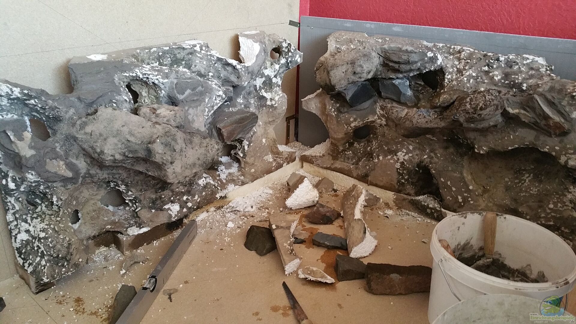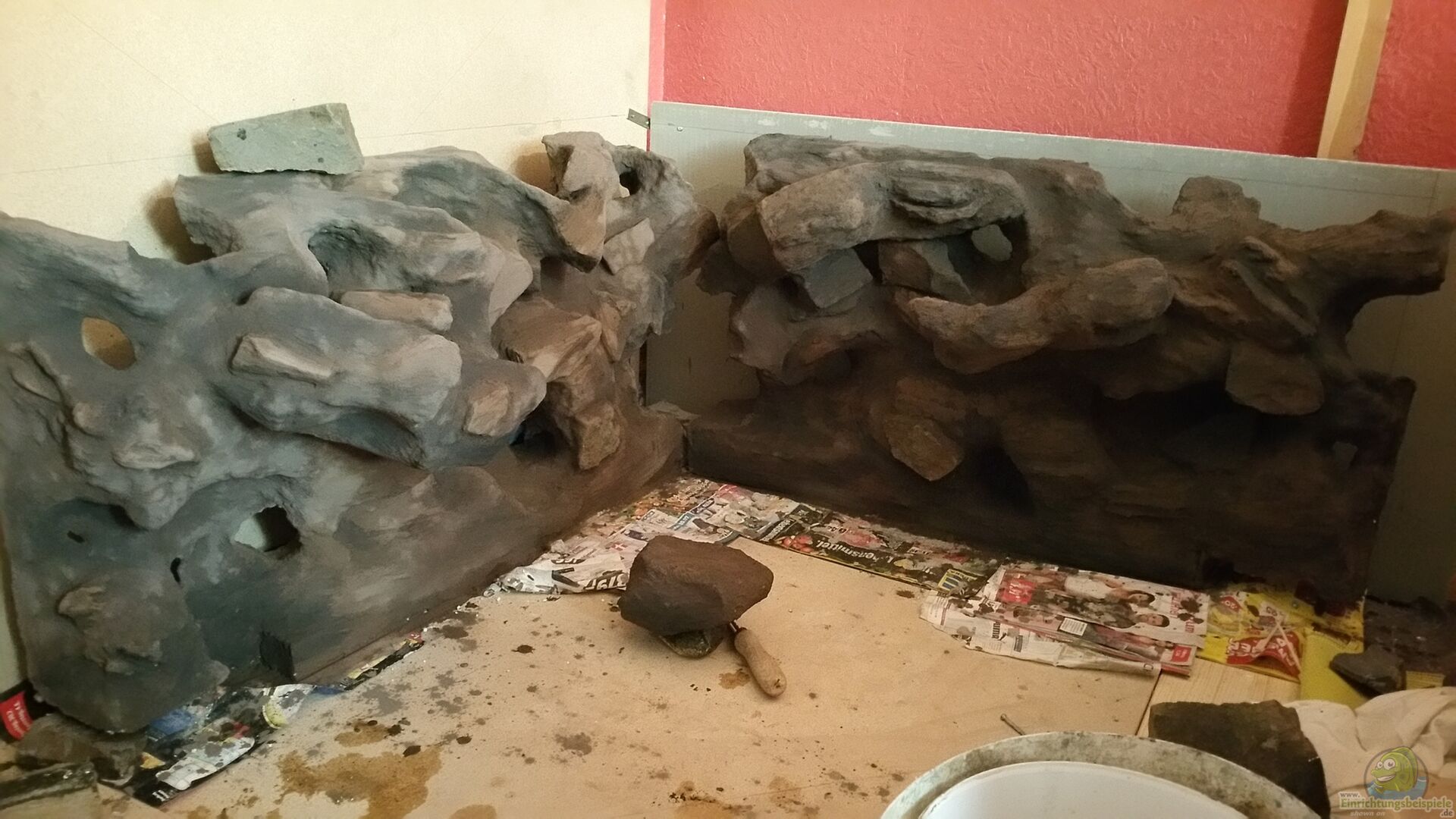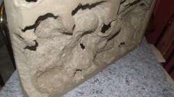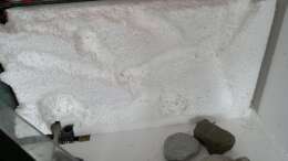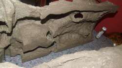 Hinterschwimmbare Rückwand aus Styropor 1, 20x0, 60x0, 14m, Eigenbau mit Höhleneingängen und Felsvorsprüngen. 10mm Styroporplatte zum Schutz der Bodenplatte.