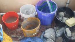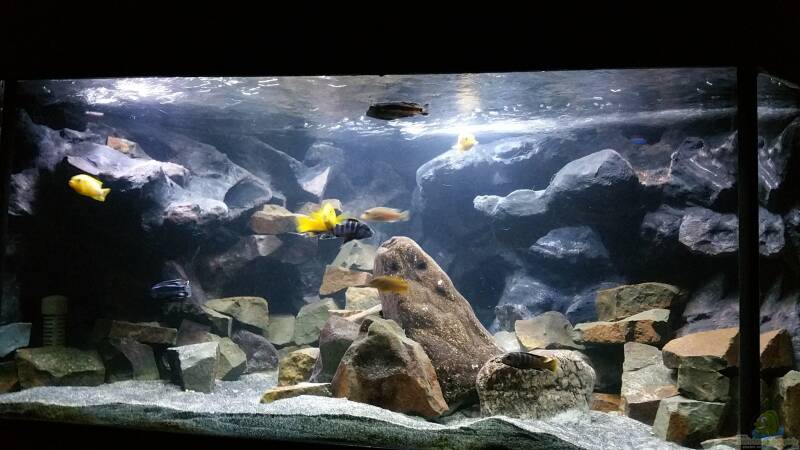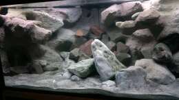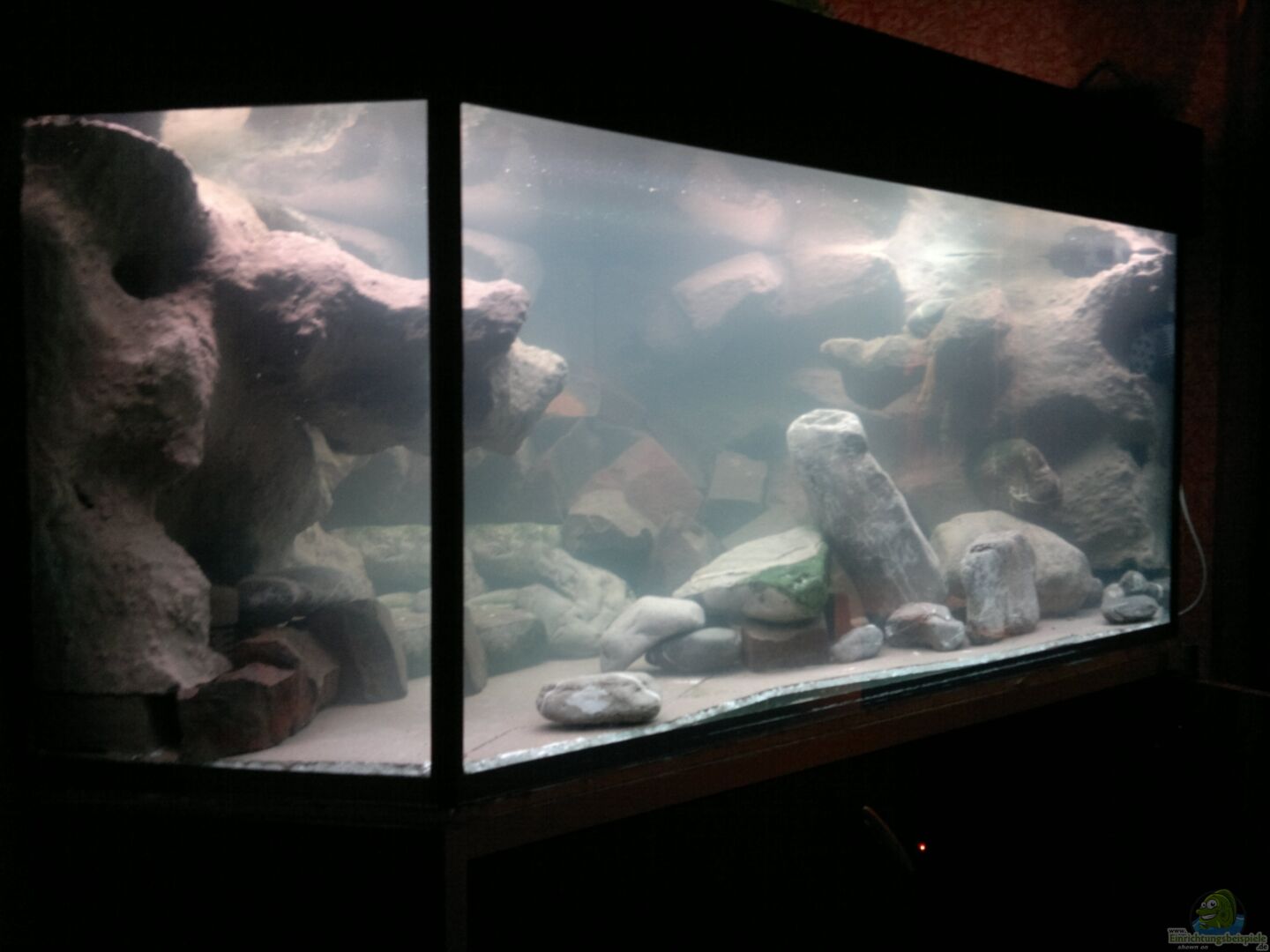 Bodengrund besteht aus einem Gemisch von beigen und schwarzen Sand der Körnung 0, 4-0, 8 von Hornbach. Es befinden sich ungefähr 35kg im Becken.