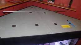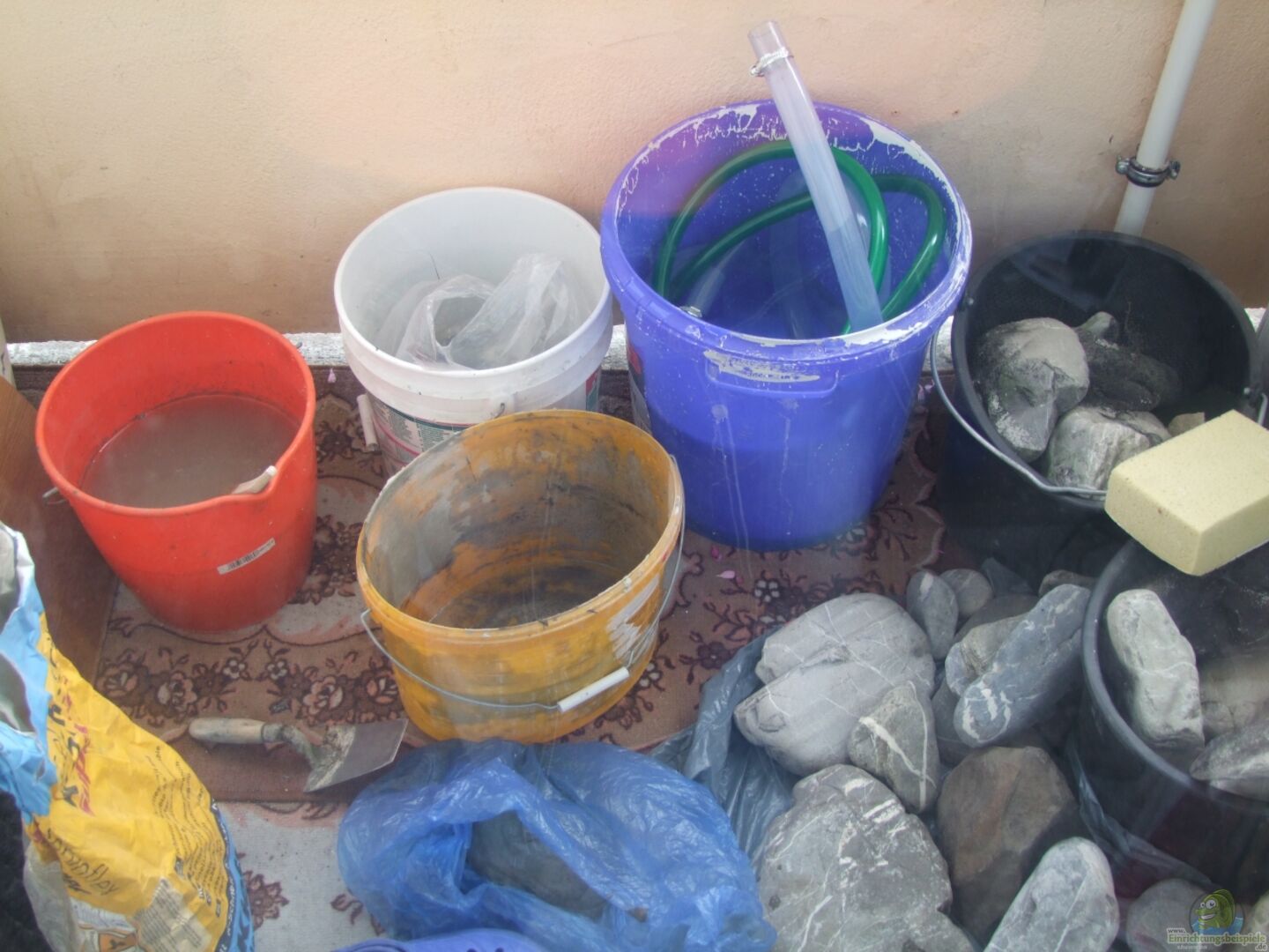 Das Becken ist ein Delta-Becken mit den Massen Schenkel 1, 20m x Seite 0, 40m x Front 1, 13m und Höhe 0, 60m. Das Becken hat 4 Bohrungen im Boden für die Filteranschlüsse, dort habe ich 4 Tankdurchlässe verschraubt und jeweils einen Absperrhahn verbaut.
