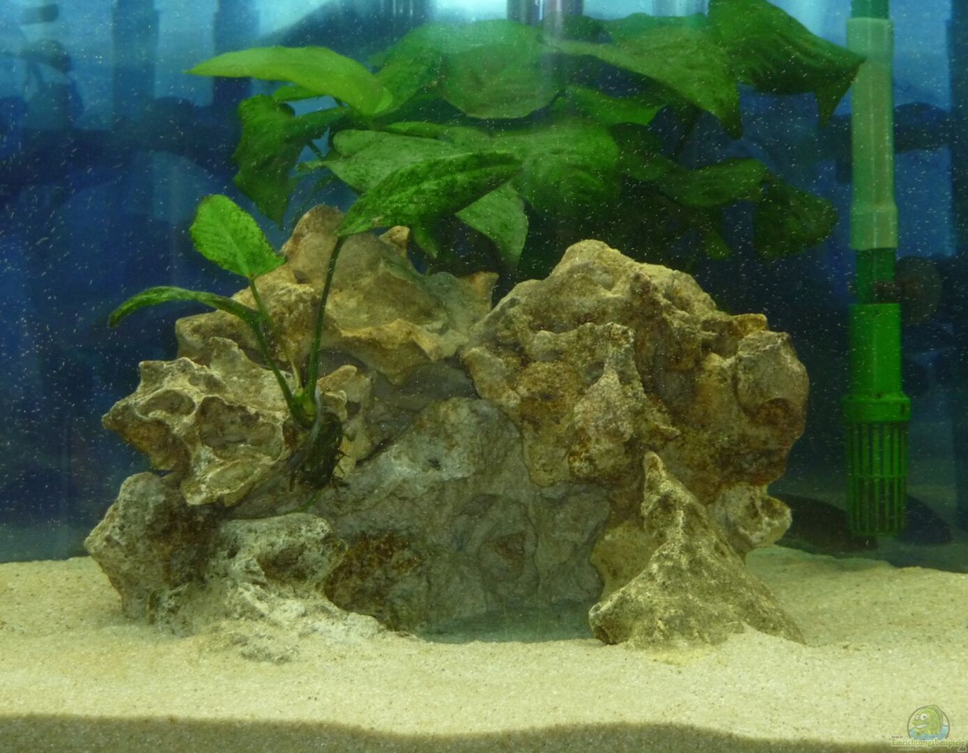 Was mir eher nicht gefällt, sind die Aufbauten. Das wirkt, als wären die einfach mal so reingestellt und fertig. Ich würde die Aufbauten im hinteren Bereich mal erhöhen (damit sieht man auch den Filteransaugstutzen nicht) und vorne viel Schwimmraum anbieten, unterbrochen von einigen einzelnen Steinen.