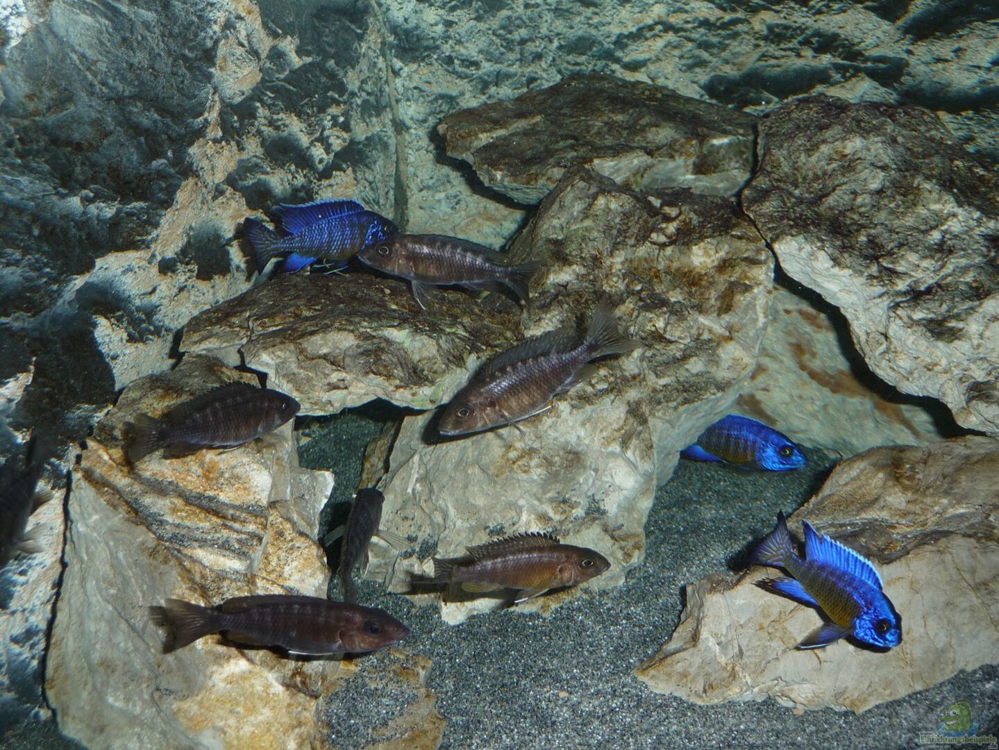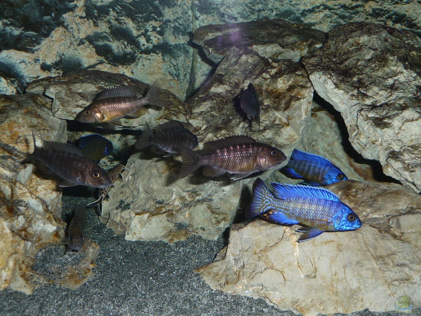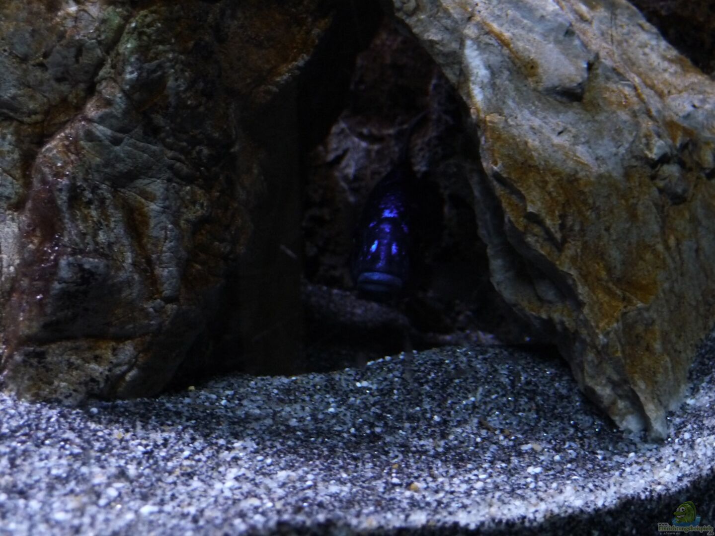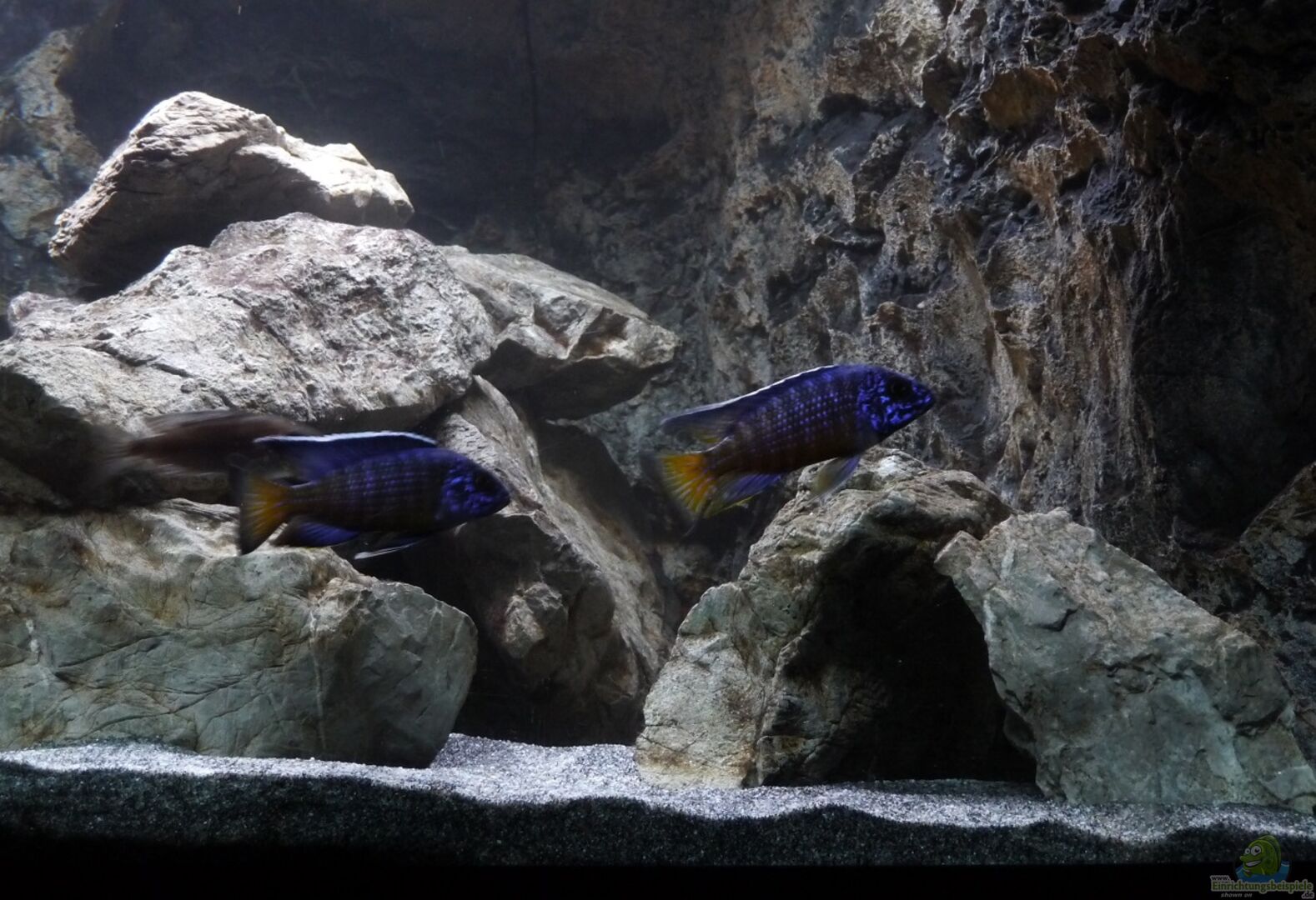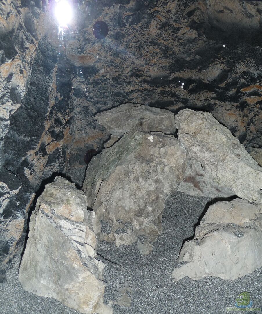 Im Malawisee benützen auch mehrere Aulonocara Surtgranti Ngara Böcke grö??ere Höhlen miteinander ohne dass es zu Problemen kommt. Im Aquarium könnte die Situation vielleicht anders aussehen. Aber aus Platzmangel versuche ich diese Lösung, da ich alle geplanten Aufbauten nicht untergebracht habe.