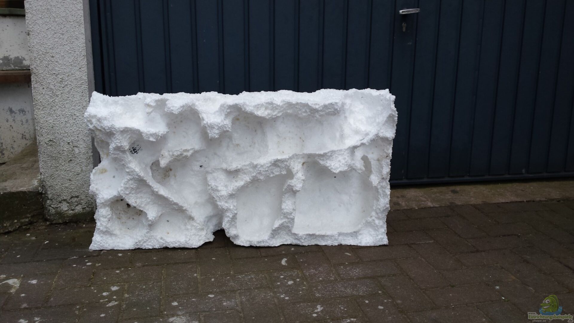 Selbstgebaute Rückwand (aus Styropor, Fliesenkleber, Zement, Epoxydharz) mit Filter- und Heizungsschacht