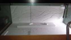 Rückwand ebenfalls aus styroporplatten selbst zurecht gemacht und mit dunklem fliesenkleber abgedichtet zuvor noch mit spezial Farbe Blau und mit schwarzen Schattierungen bemalt.