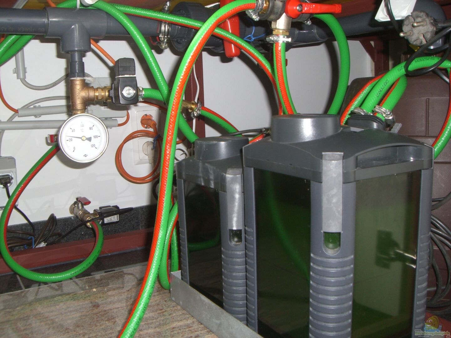 1x Eheim 2224 und 1x Eheim 2222 die gleichzeit laufen. Einmal pro Woche wird ein Filter gereinigt. Somit bleibt die Bakterienkultur für die Filterung immer in einem Filter erhalten, während in dem anderen Filter die Bakterienkultur wieder aufgebaut wird.