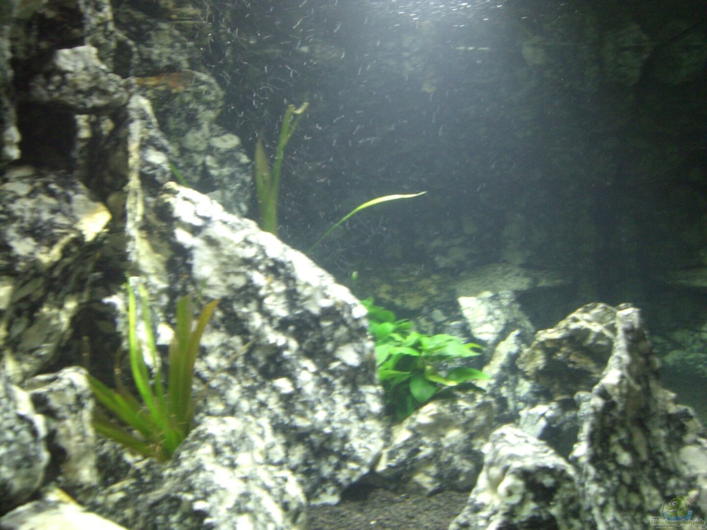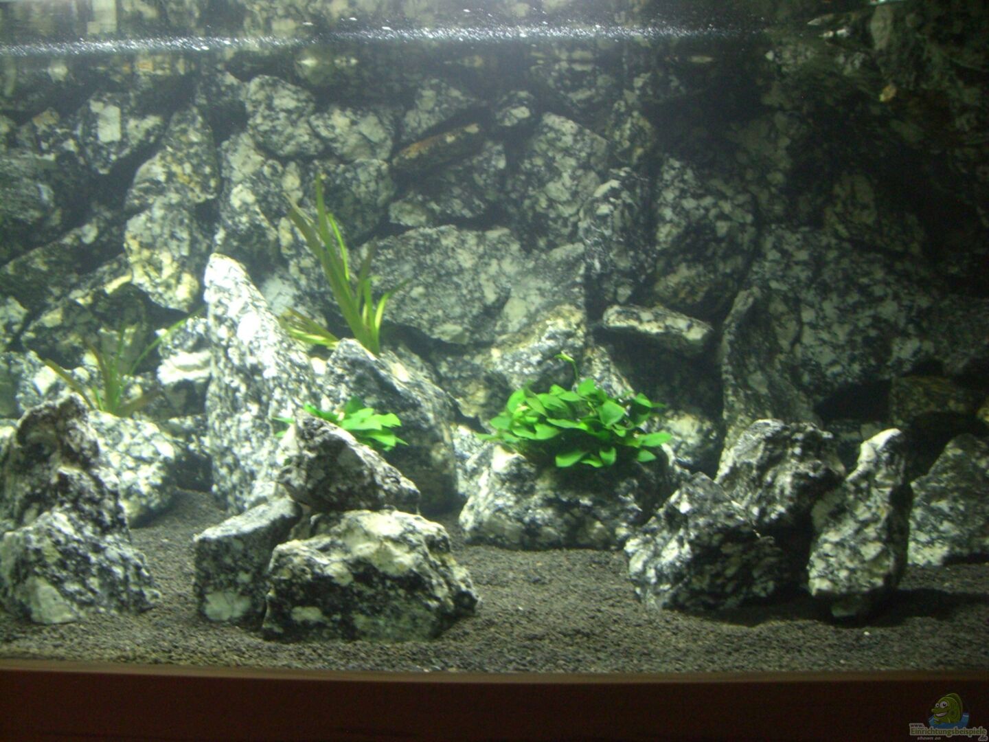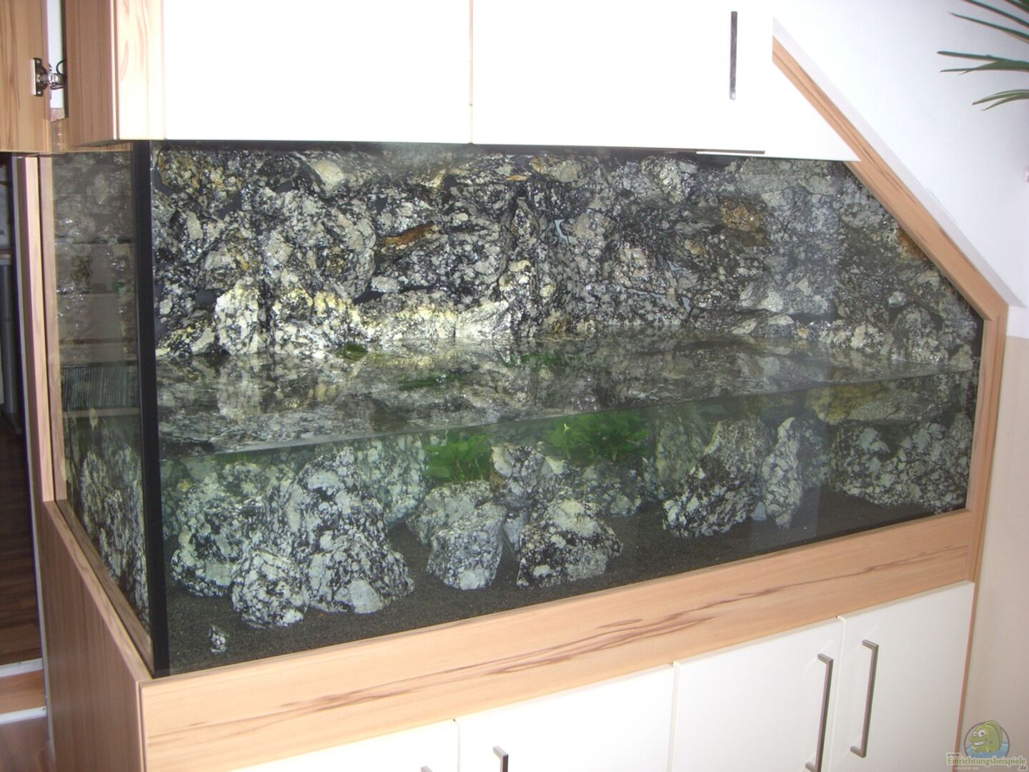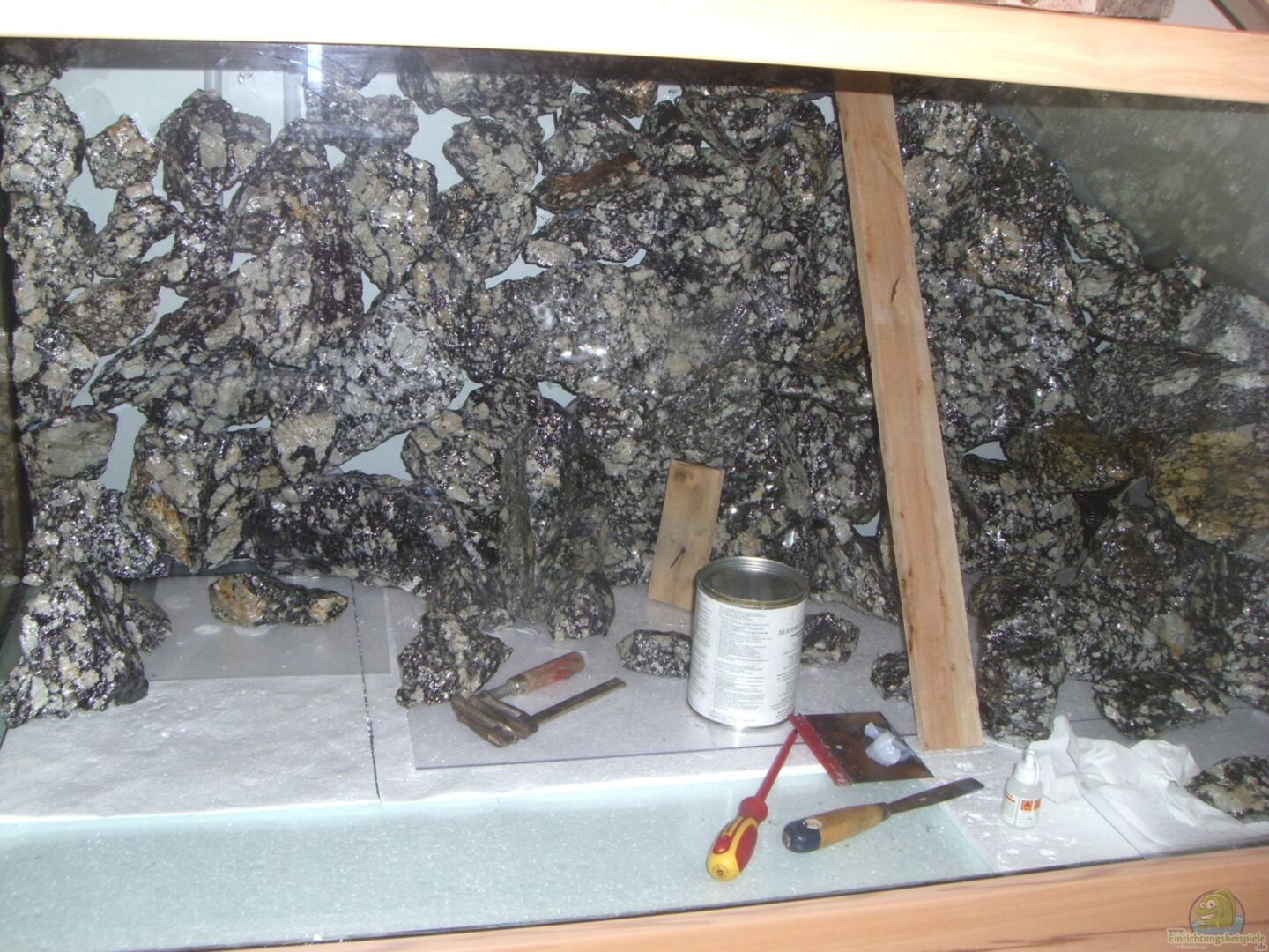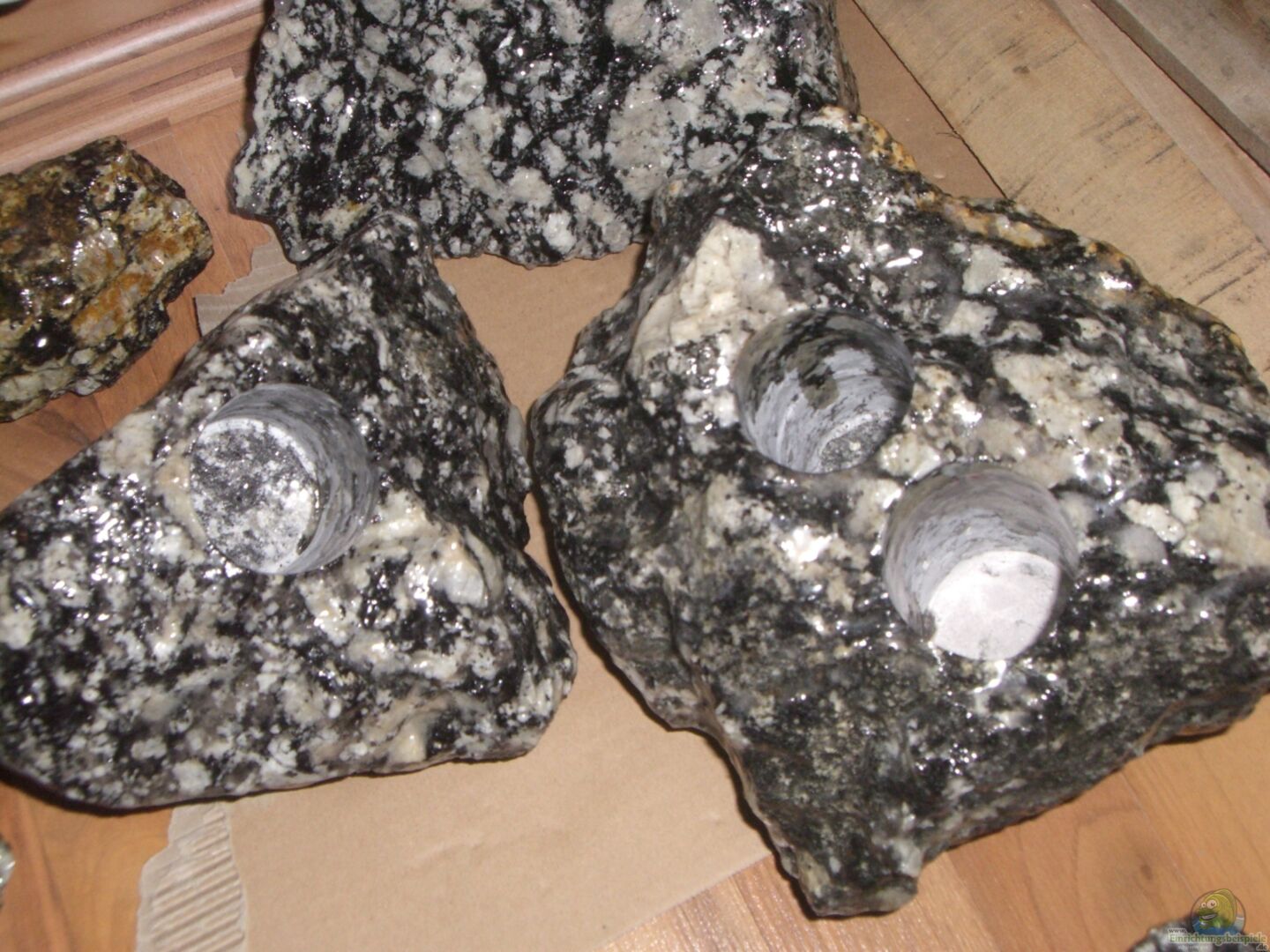 Die Rückwand besteht aus ca. 200 kg massiven Mühlviertler Granitsteinen, die ich vorher mit Epoxydharz versiegelt habe. Durch das versiegeln der Steine wurden scharfe Kanten abgerundet und die Oberfläche der Steine schön glatt. Das Problem am Granit ist, er ist verdammt schwer. Um das massive Gewicht der Rückwand gleichmässig zu verteilen, habe ich eine 1cm dicke Styroporplatte und eine 0, 5 cm dicke Plexiglasplatte untergelegt. Unbehandelter Granit nimmt aus dem Wasser viele Nährstoffe auf, und veralgt ziemlich schnell. Durch das versiegeln der Steine mit Epoxydharz wird der Granit daran gehindert, vorzeitig zu veralgen.