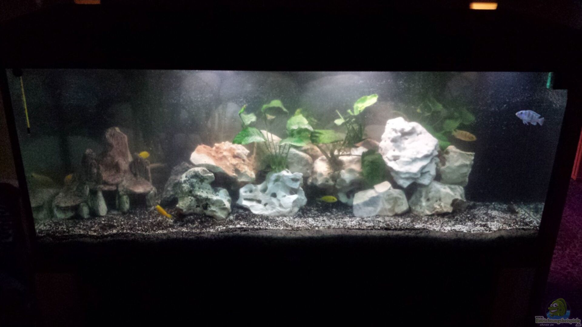 Die Beleuchtung ist zu hell für ein Malawiaquarium, das Licht wird sehr stark vom wei?en Aquariensand reflektiert. Dieses kleinere ?bel ist schnell aus der Welt geschafft. Eine Röhre die du teilweise mit Alufolie umwickelst reicht vollkommen aus. Die Zweite ersetze einfach durch eine kaputte Röhre oder isoliere die Kontakte. Aber lasse nie eine Fassung offen!!