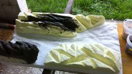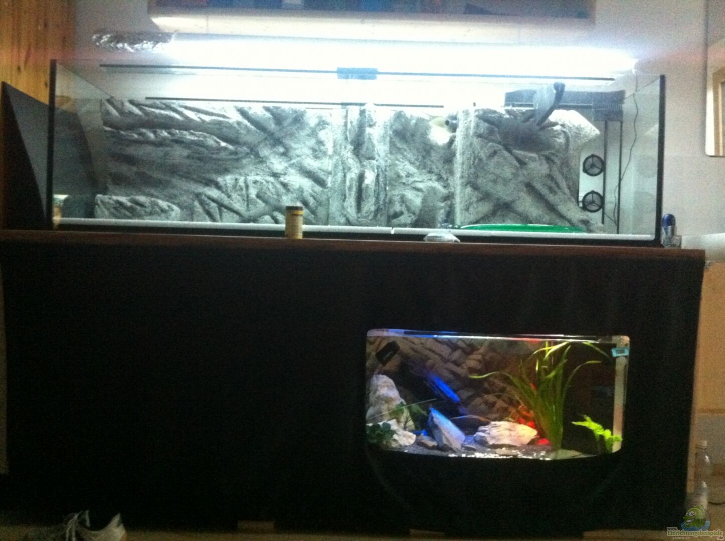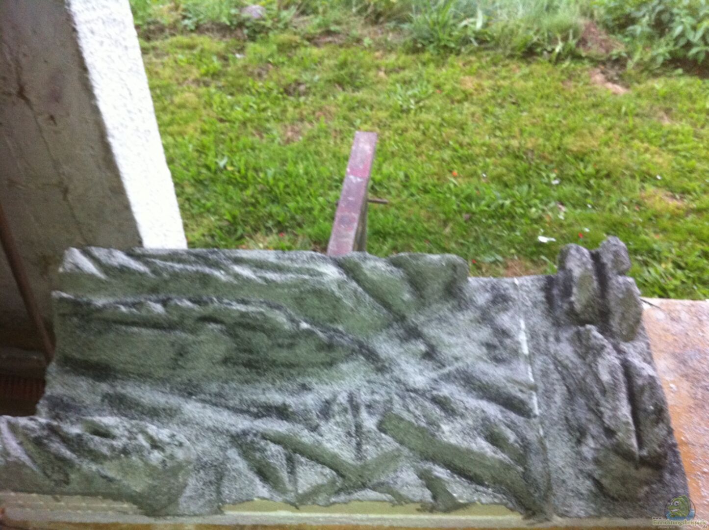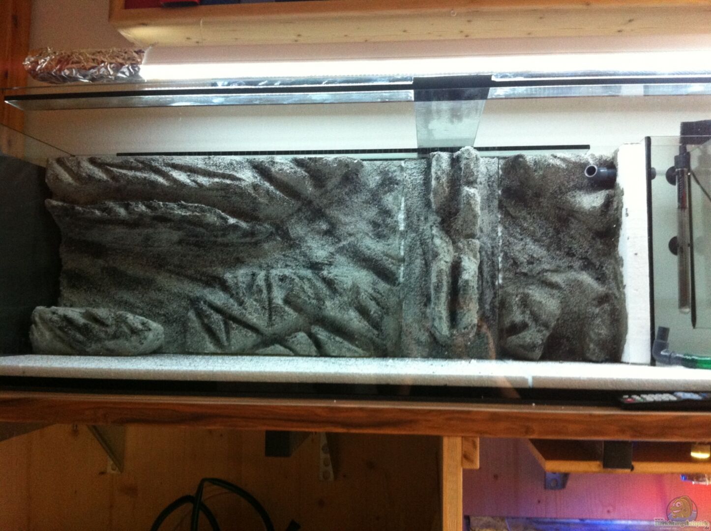 Habe nach langem hin und her mich doch für eine 3D Rückwand entschieden. Da ich aber nicht einsah, mir eine Rückwand zu kaufen die teurer wie das eigentliche Aquarium ist, habe ich mich entschlossen selbst eine zu bauen. Die Rückwand besteht aus Styropor, Silikon, Portlandzement, Sand und Epoxidharz das speziell für Aquarien geeignet ist. Man könnte auch bestimmt ein 0815 Epoxidharz aus dem Baumarkt hernehmen, jedoch war mir die Sache zu unsicher wegen eventuellen Ausdunstungen. Eingeklebt wurde die Rückwand mit einem transparenten Aquasilikon.