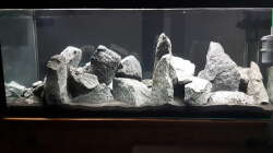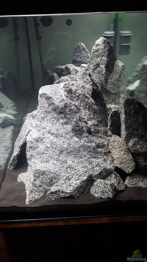 Auf dem Beckenboden befindet sich eine 1, 5cm Dicke Styroporplatte zum Schutz des Glases vor den schweren Steinen.
