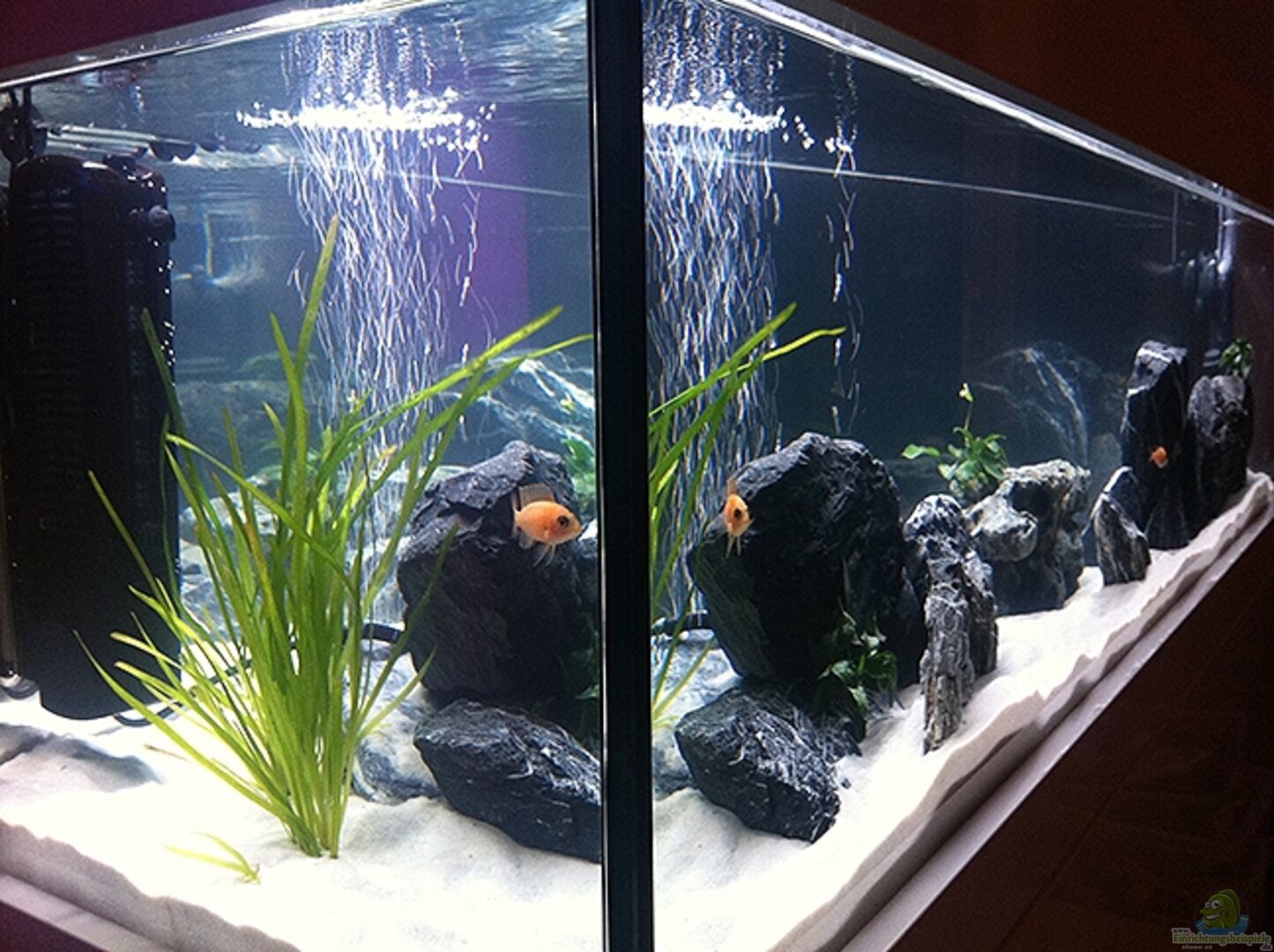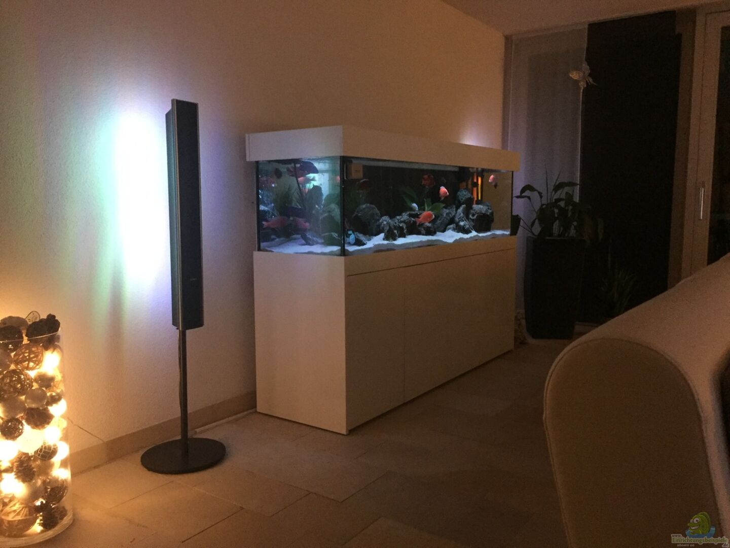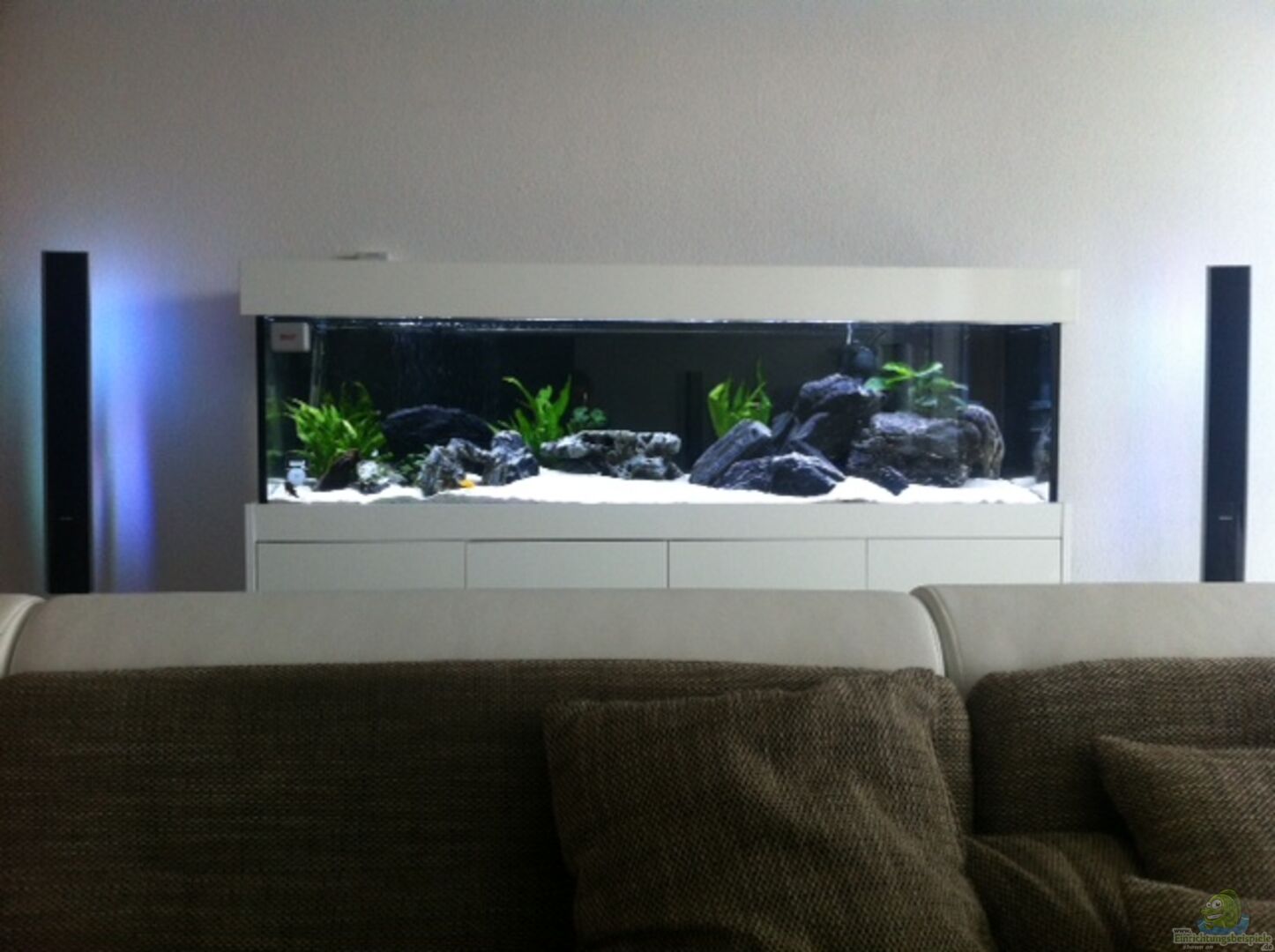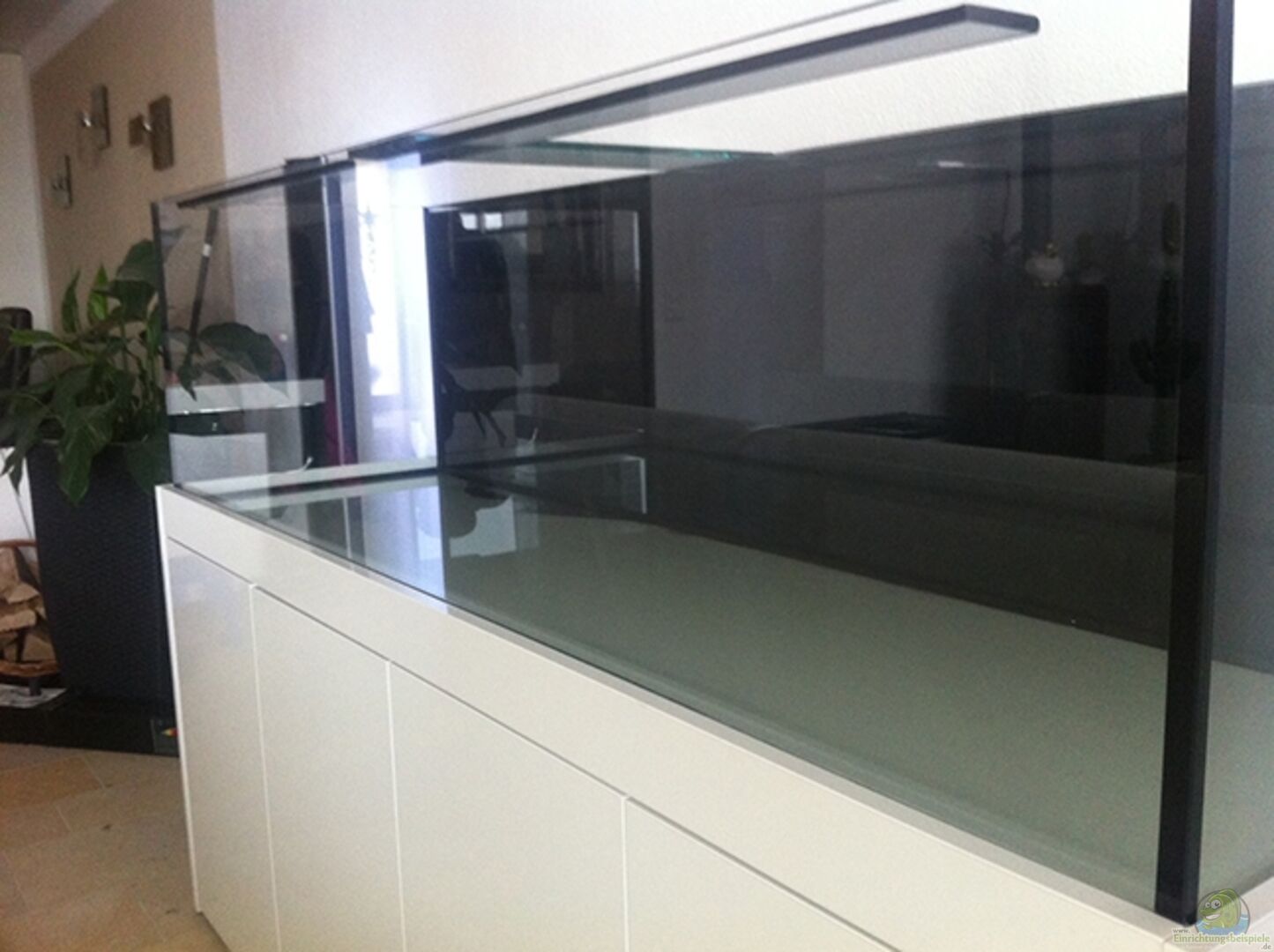 Das Becken und der passende Unterbau (Sideboard) wurde vom Schreiner bzw. Aquarienbauer massgefertigt. Das Möbel sowie Kiesblende und Abdeckung sind weiss, hochglanz. Die Rückwand ist komplett schwarz-matt, eine hinterlegte Styroporplatte sorgt für die Isolation des Beckens. Das Aquarium ist komplett und "rundum" aus Weissglas (optiwhite).