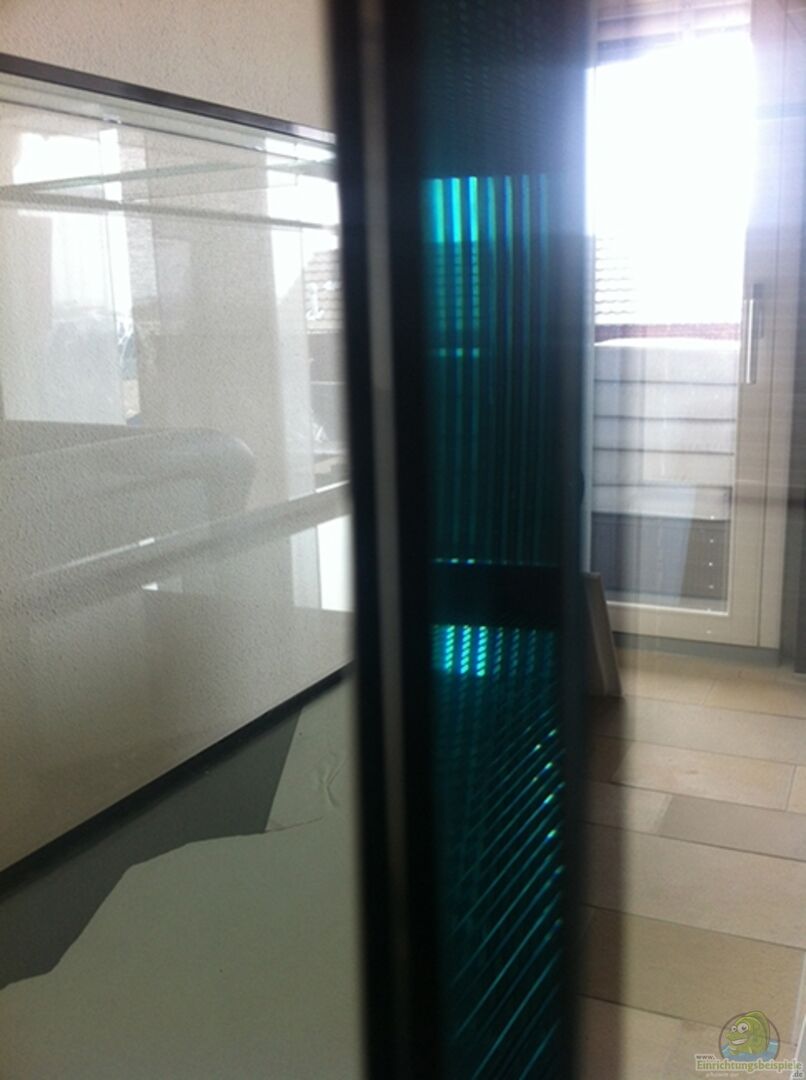 Nun habe ich auch LED-Strips für die Rückbeleuchtung des Beckens verbaut. Insgesamt 4 Leisten à 30cm, die über eine Fernbedienung dimmbar sind und das ganze Farbspektrum abbilden können. Die zwei Bilder zeigen jeweils den Status in "blau" und "grün".